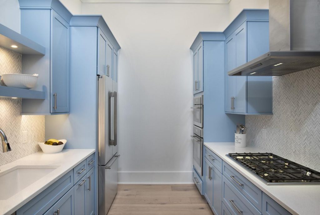 Drury’s favorite kitchen, Hers, is where daily meal preparation takes place. It is tucked away from the main kitchen off a secondary hallway. Galley style, this space is the essence of efficiency, making the most of a small space. It is beautifully decorated with custom cabinetry in Sherwin Williams’ Respite paint color, stainless steel appliances, and stunning counters and backsplash. His kitchen is a professional grade outdoor cooking center with a fabulous view. Located on the screened porch overlooking the pool and courtyard, it features a built-in grill, double side burners, a 30” Asado