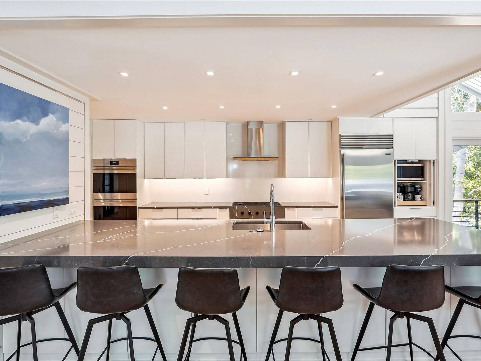 Beautifully renovated in 2022, 10 E. Beach Lagoon is located on an Oceanfront paddle lot and not to be missed. This spacious 6-bedroom, 6.5-bathroom vacation home is stunning on the inside and out with luxury finishes, beautiful artwork and is within a short walking distance to the beach. The yard is full of lush landscaping as you walk up the partially covered walkway to the main entrance. Inside you’ll first notice the light hardwood floors throughout and the open concept living area. The living room is in the center of the home and has cathedral ceilings, a blue sectional couch, two gray swivel chairs, a mounted 75” TV over the fireplace surrounded by built-in bookcases that has books and games for your enjoyment. Behind the living room is the fully equipped kitchen with gray, granite countertops, stainless steel appliances including a Sub-Zero refrigerator, a 5-burner Wolf gas stove and two ovens. This gourmet kitchen is sure to please the chef in your family! There are six stools at the countertop – a great place to enjoy an appetizer while watching the chef prepare your meal. The adjacent dining room has a large wooden table that seats 10 and has a dry bar with mini fridge. The sliding door opens to a small balcony that overlooks the back yard.