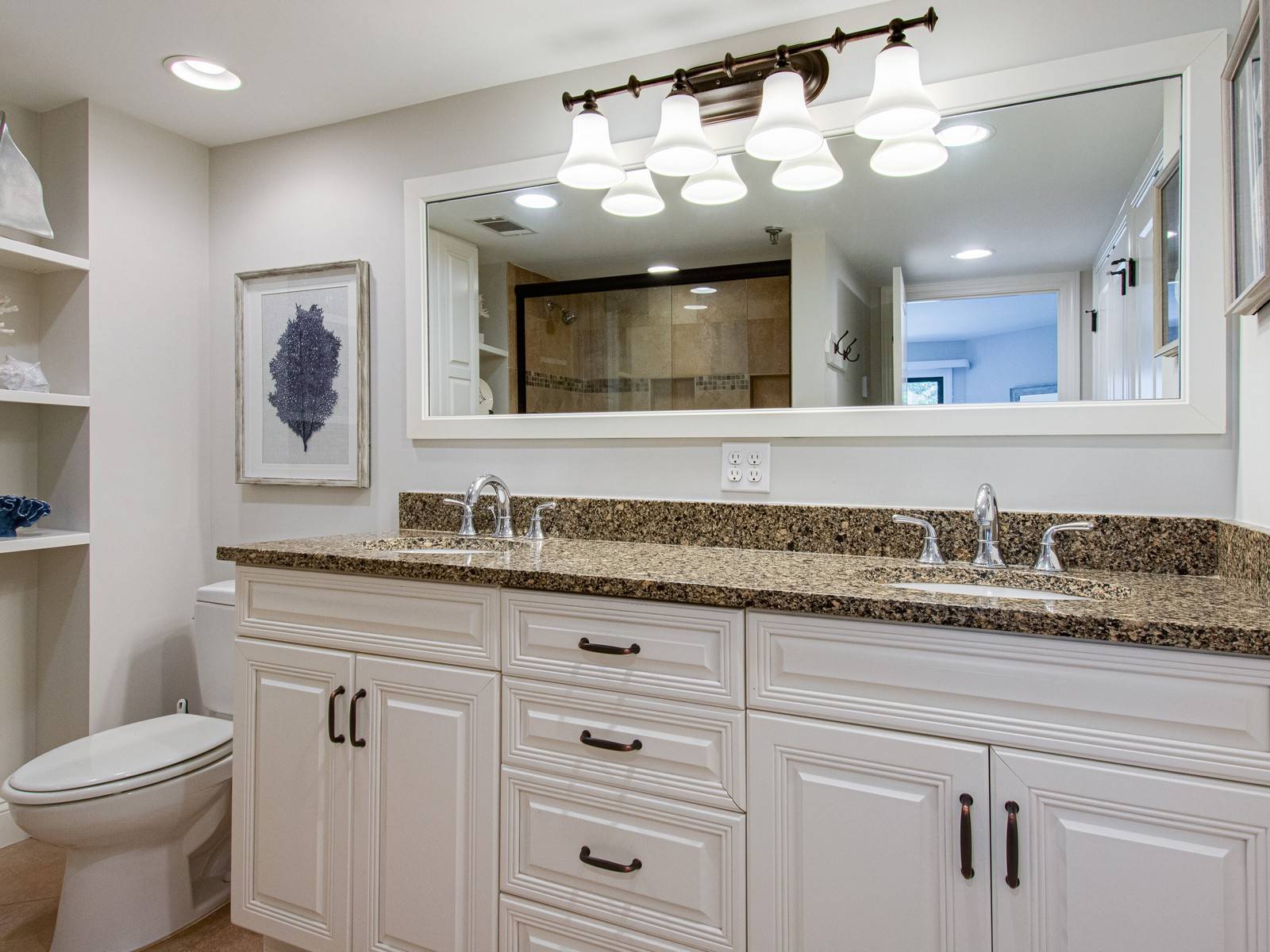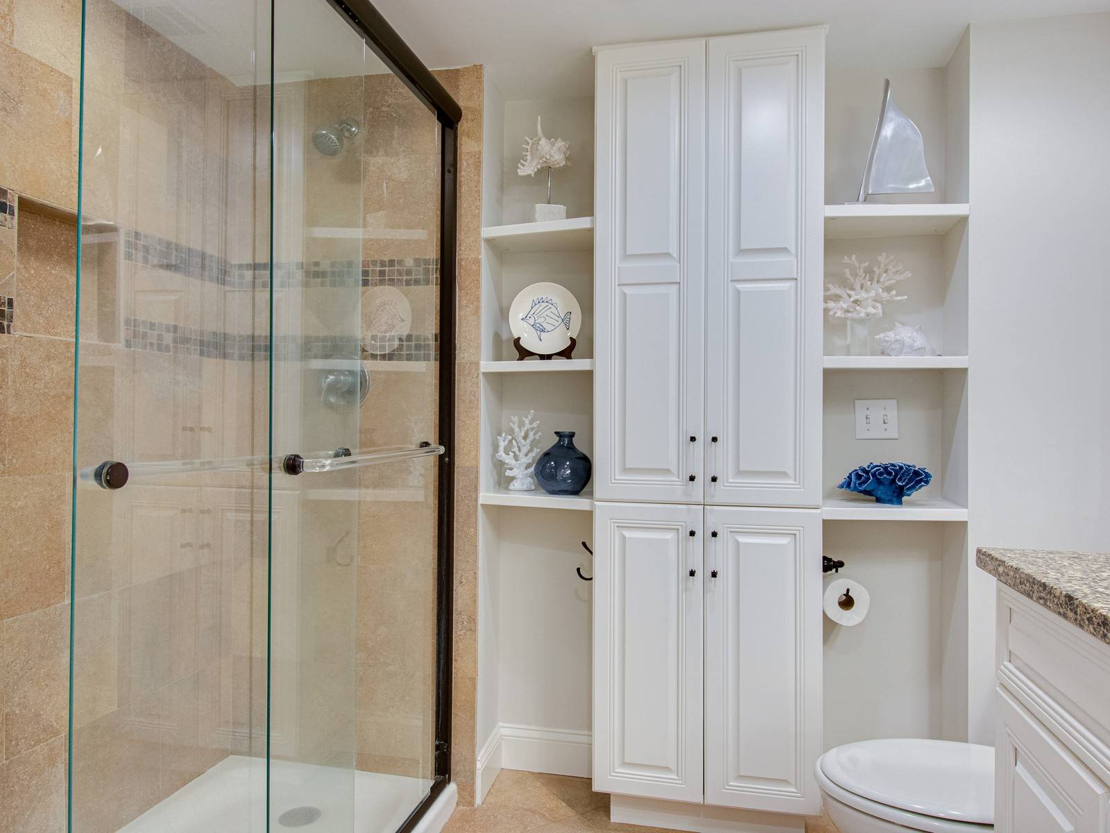 Behind the French doors is the master bedroom. This room has a soft blue spread, gray walls, cream colored rug and lots of coastal touches throughout. There is a king bed and a 40″ TV. You also have access to the balcony shared with the living room. The master bathroom has double granite vanities, nice built-in shelves, and a walk-in shower.