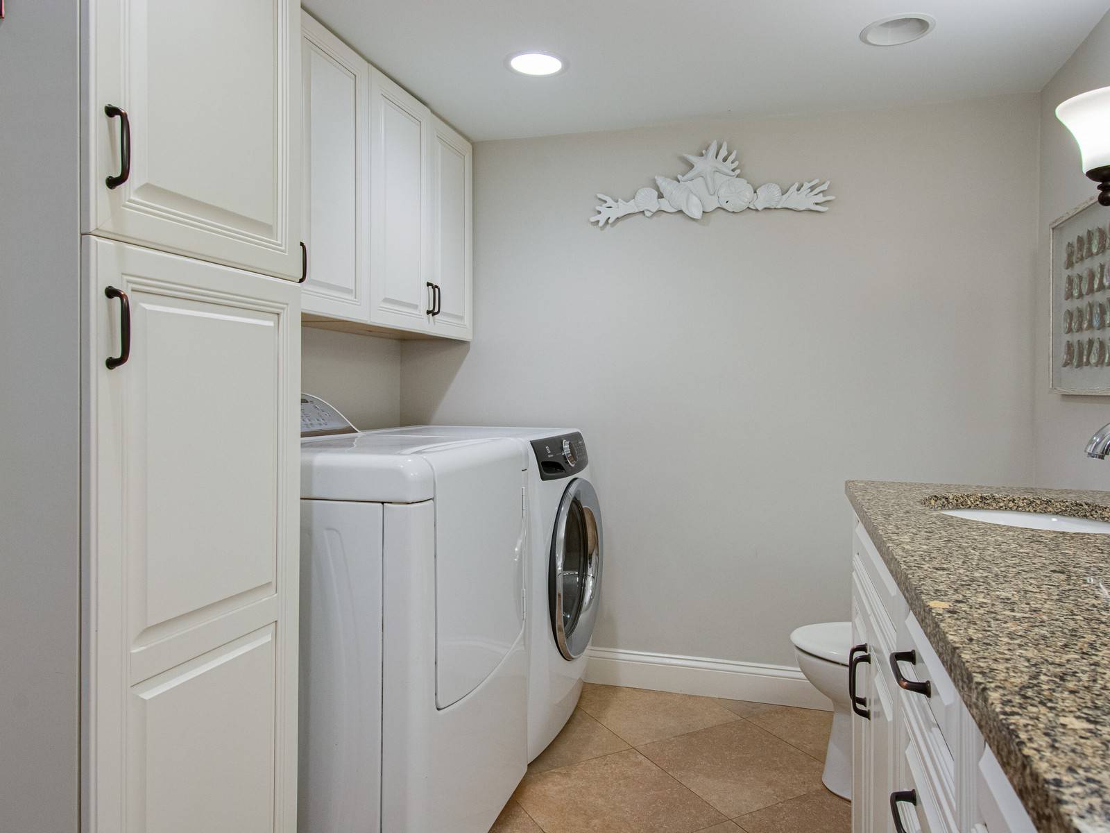 To the left of the foyer is an oversized bathroom with double granite vanities, a tub/shower combo, and a full-size washer and dryer. The guest bedroom is on this side as well and features one queen bed, one double bed, and a mounted 40″ TV. The sliding door opens to a private balcony with two Adirondack chairs that overlook the water fountain and has partial ocean views. Perfect for some private time to catch up on your favorite book or just relax!