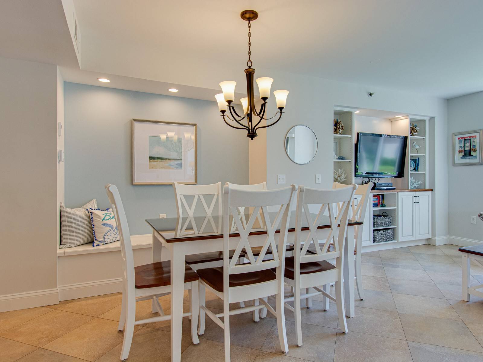 The main living space is all open and begins with the updated kitchen with gorgeous granite counters, an island that seats two, stainless-steel appliances, and all the amenities you need to dine and entertain! The glass topped dining room table seats six and is offset by a sky-blue accent wall with a built-in bench seat. In the living room you will find a sofa, two accent chairs, a mounted 50″ TV, and a built-in bookcase full of books. Enjoy the ocean views from the living room windows or step out to the covered balcony that is equipped with a table that seats four to enjoy coffee, afternoon cocktails, or a meal. The views are nothing less than calming, tranquil, and serene with the lagoon fountain below and the ocean off in the distance.