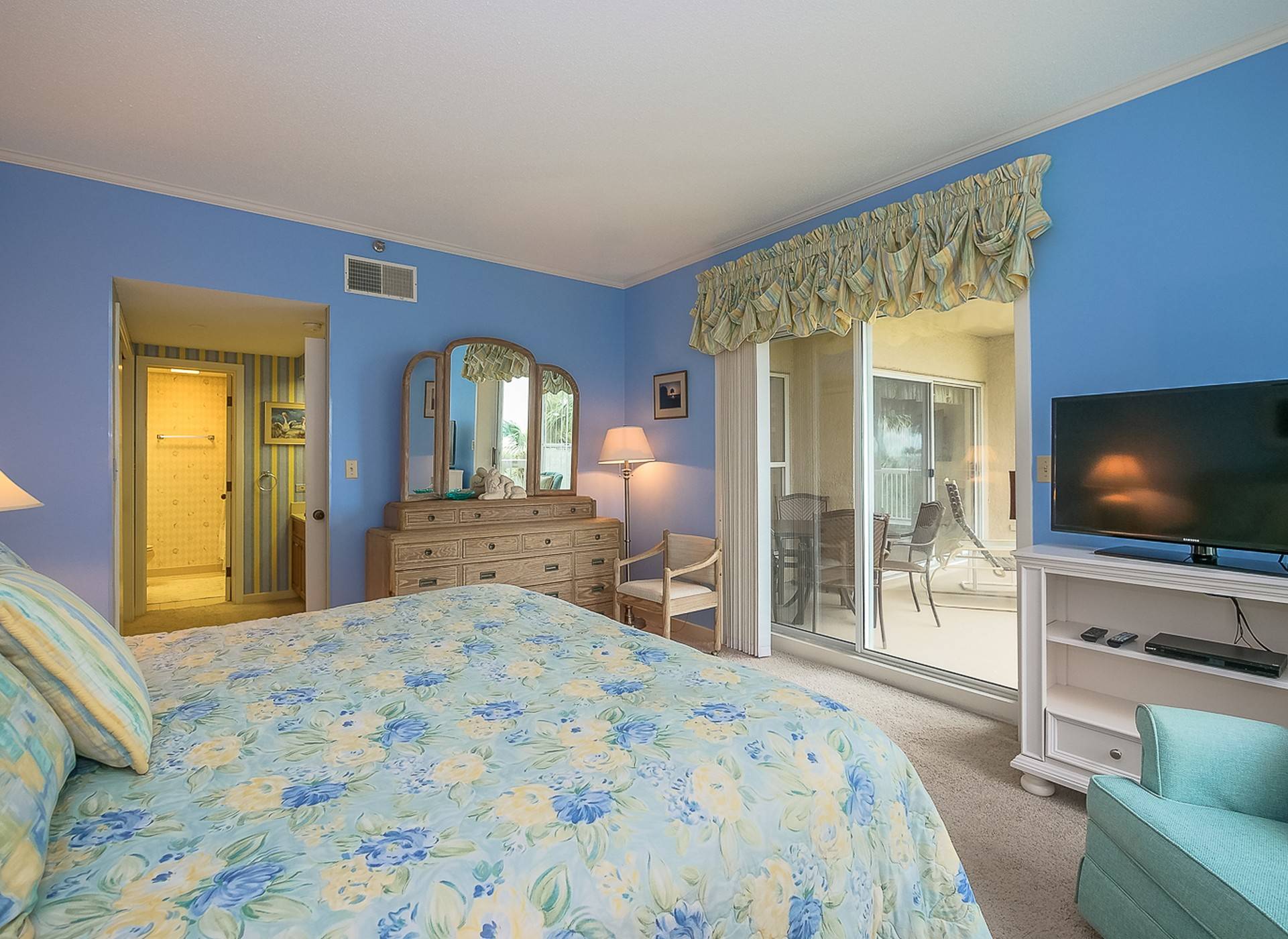 The master bedroom offers windows with beautiful views, it is carpeted, and has blue walls. There is a king bed with a colorful headboard, two accent chairs, and a 40″ TV with a DVD player. The newly renovated master bath has a separate sink vanity area with granite countertops and a private bath with newly renovated walk-in shower. This room has access to the balcony as well.