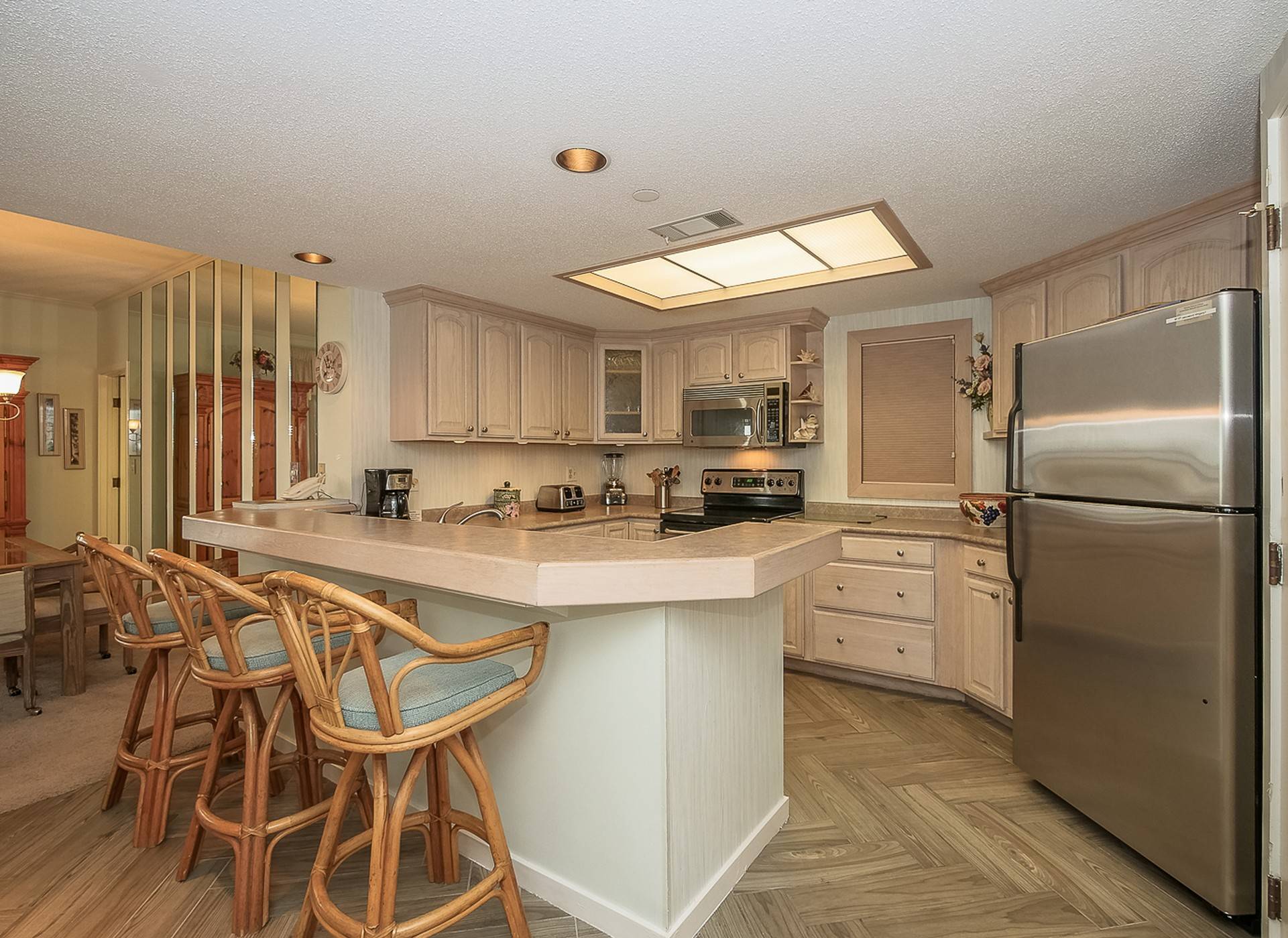 The U-shaped kitchen has attractive cabinets, pastel blue striped walls, stainless steel appliances, and is open to the dining and living areas. Even standing in the kitchen, the chef will have beach and ocean views. The flooring in both the kitchen and hall is wood look plank tiles and compliments the countertops and cabinetry. The kitchen also features a breakfast bar with three stools.