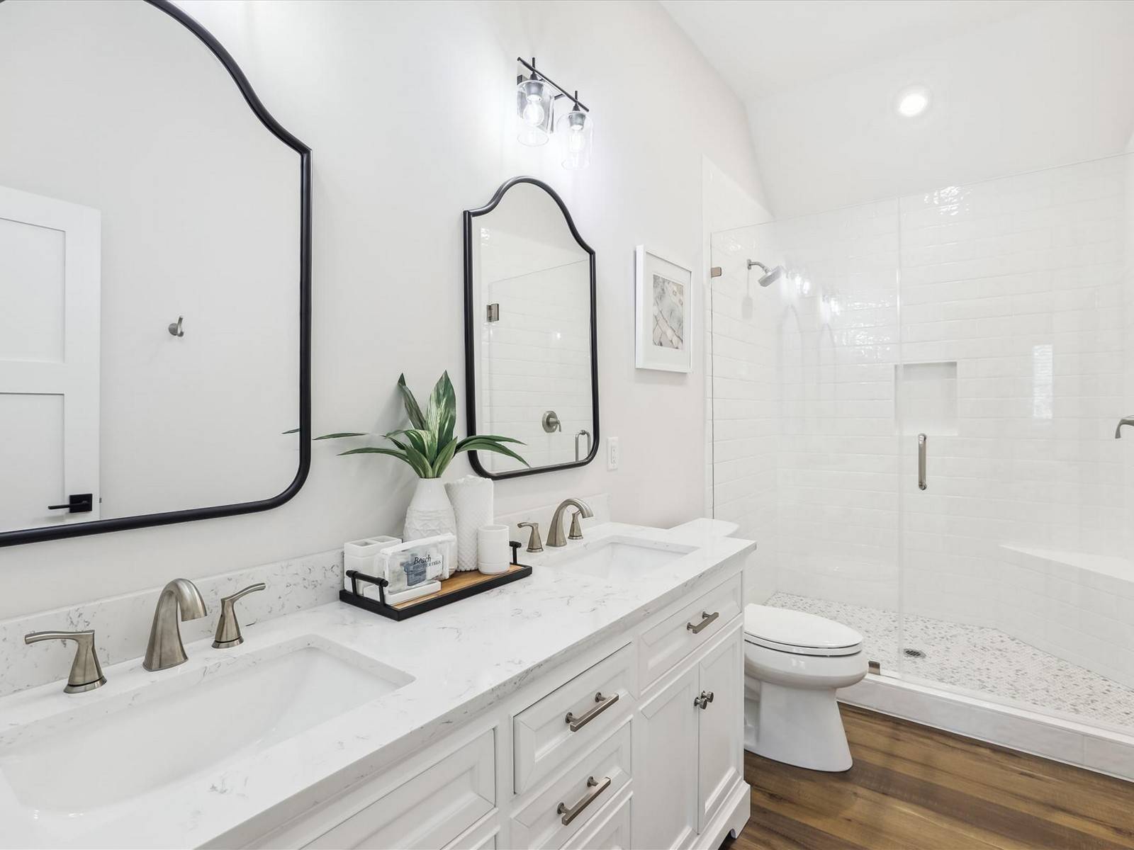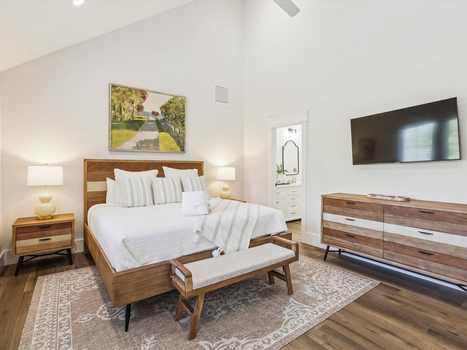Back inside, behind the kitchen sliding barn door, is the laundry room with sink and GE front-loading washer and dryer. This is also where the door to the two-car garage is. Up a few stairs there is a large bedroom over the garage featuring a king bed, accent chair, blue couch, and 55″ SMART TV. The private bathroom has a single granite vanity and walk-in tiled shower.