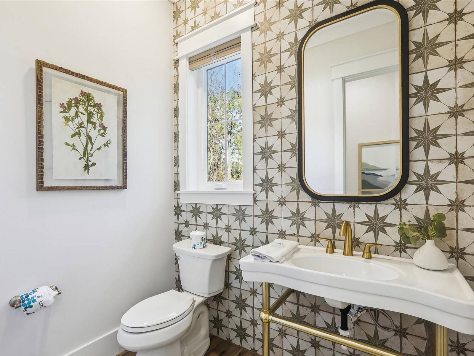 You are greeted with the southern petticoat style staircase and two rocking chairs on the front porch. The spacious open floor plan has beautiful hardwood floors throughout and stunning views of the lagoon. Enter the living room where there is a mint green couch, two tan armchairs, and a 75” SMART TV mounted over the electric fireplace. Adjacent is the state-of-the-art kitchen with stone counters, top of the line stainless-steel appliances including two Electrolux refrigerators, two dishwashers, and a 6-burner Thermador gas range. There is a vaulted shiplap ceiling and a massive 12-foot island with six cushioned stools. Additional seating is available in the dining room where there is a large round wood table that seats eight. Behind the kitchen/dining room is a wet bar with another fridge, sink, ice maker, and walk-in pantry. Down the hall is a ½ bathroom.