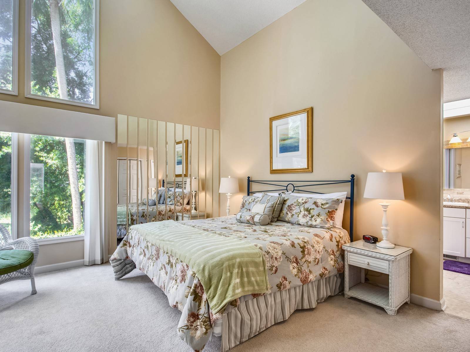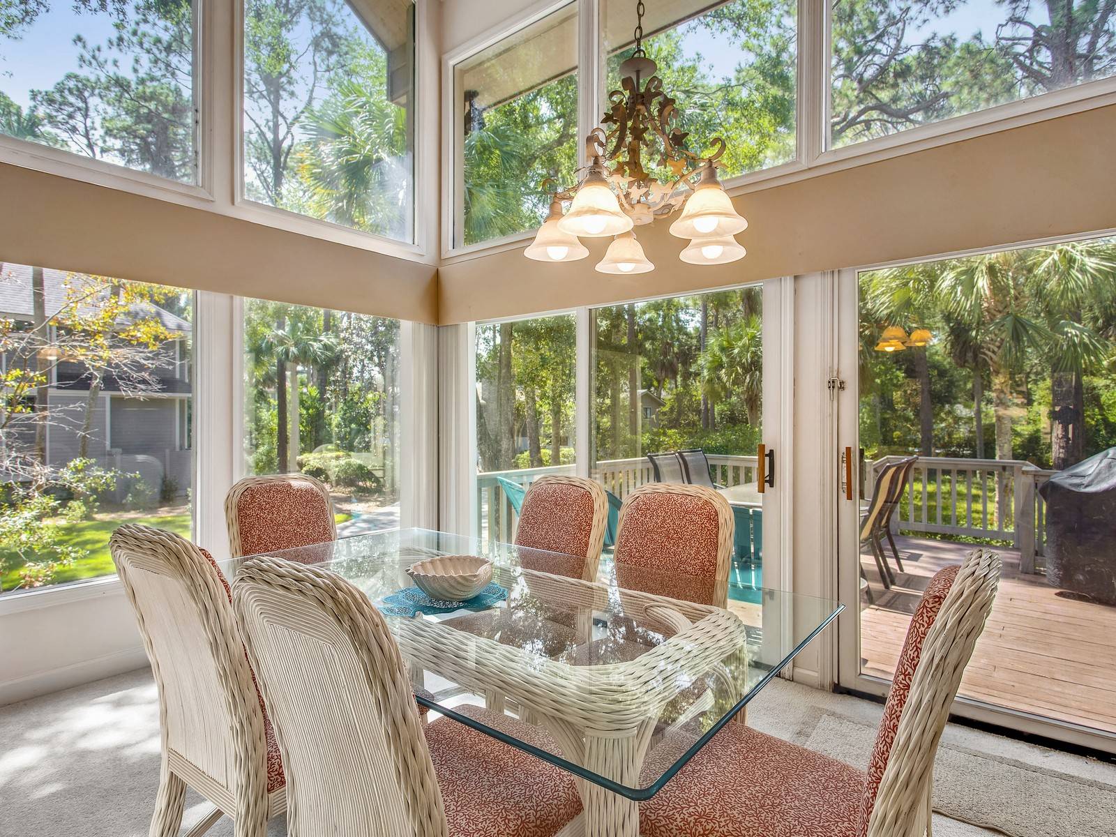 Light, bright and open – these three words describe 14 Green Heron, a beautiful 4 bedroom, 4.5 bath home located 4th row from the ocean in Sea Pines Plantation. The beach path is located behind the home through a grass yard providing easy access to the beach. The Great Room features cathedral ceilings, 50″ TV with DVD player and a wall of glass windows, which brings the outside in! The kitchen features a large breakfast bar with seating for six. The dining room is adjacent that offers a large rectangular table with seating for 10. There are 2 sliding doors from the dining room that open out to the deck which gives you the option for alfresco dining.