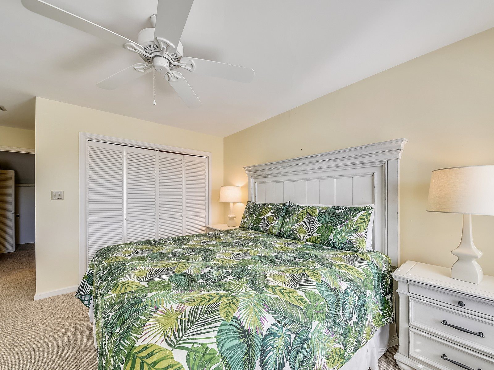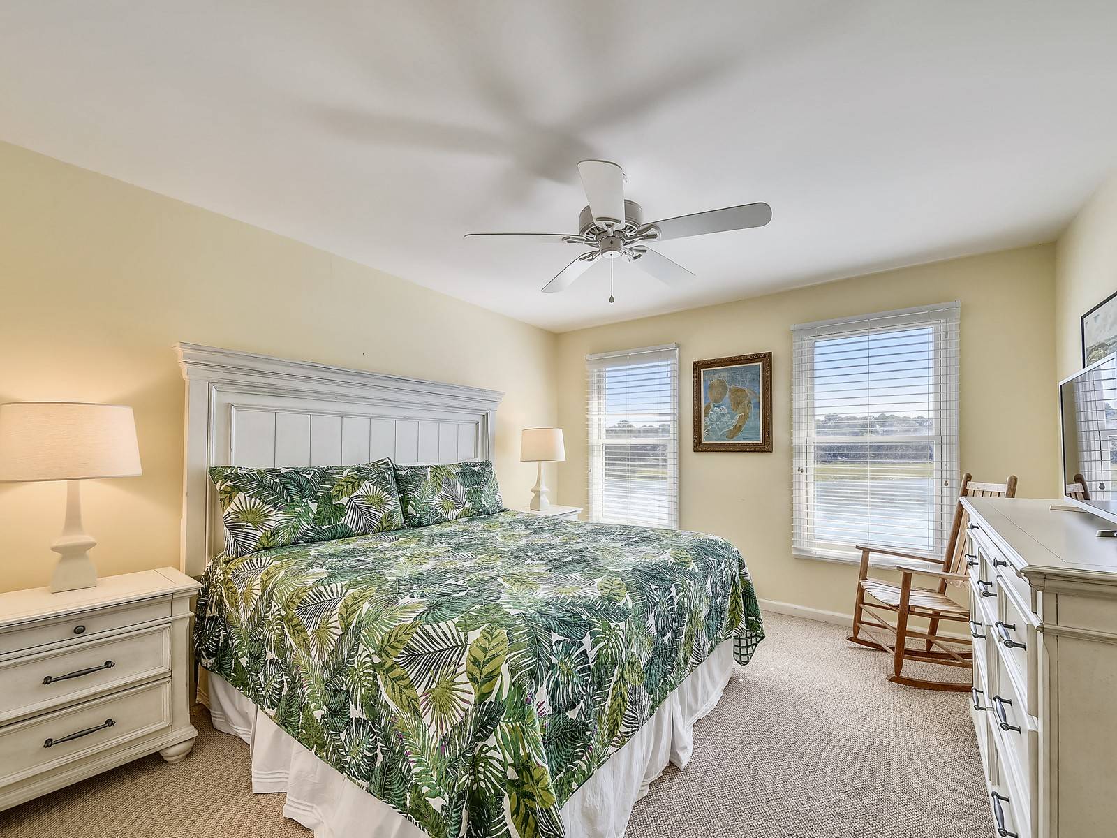 Upstairs you will find the laundry room at the top of the stairs plus another king bedroom offering privacy and solitude. There is a rocking chair, 32″ TV and large walk-in closet plus more of those wonderful water views. The private full bath has a single vanity and tub/shower combo.