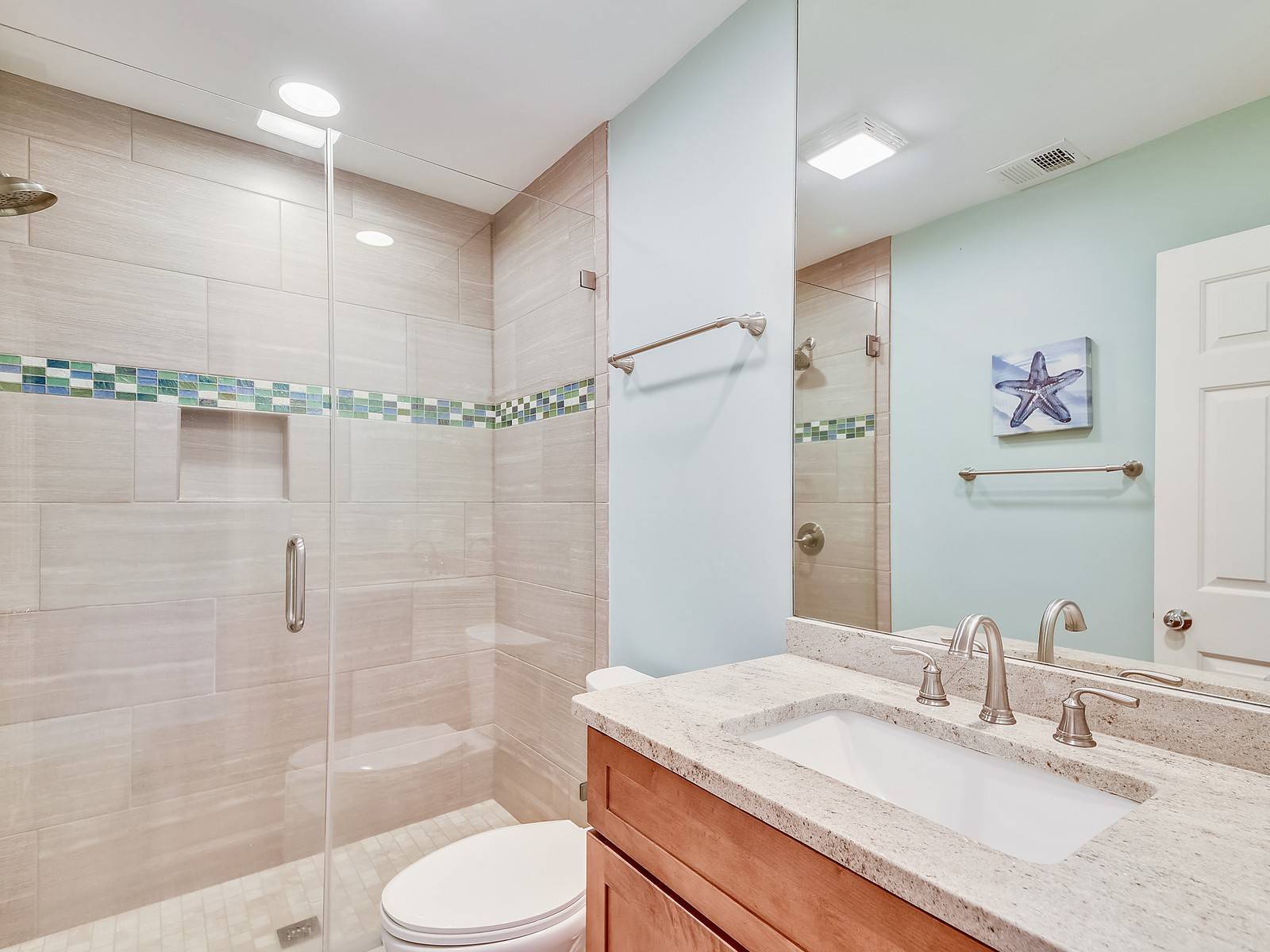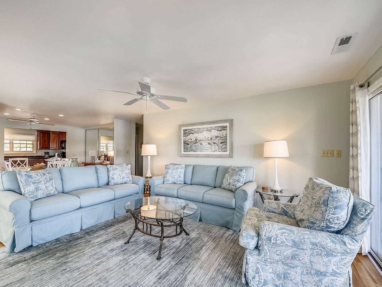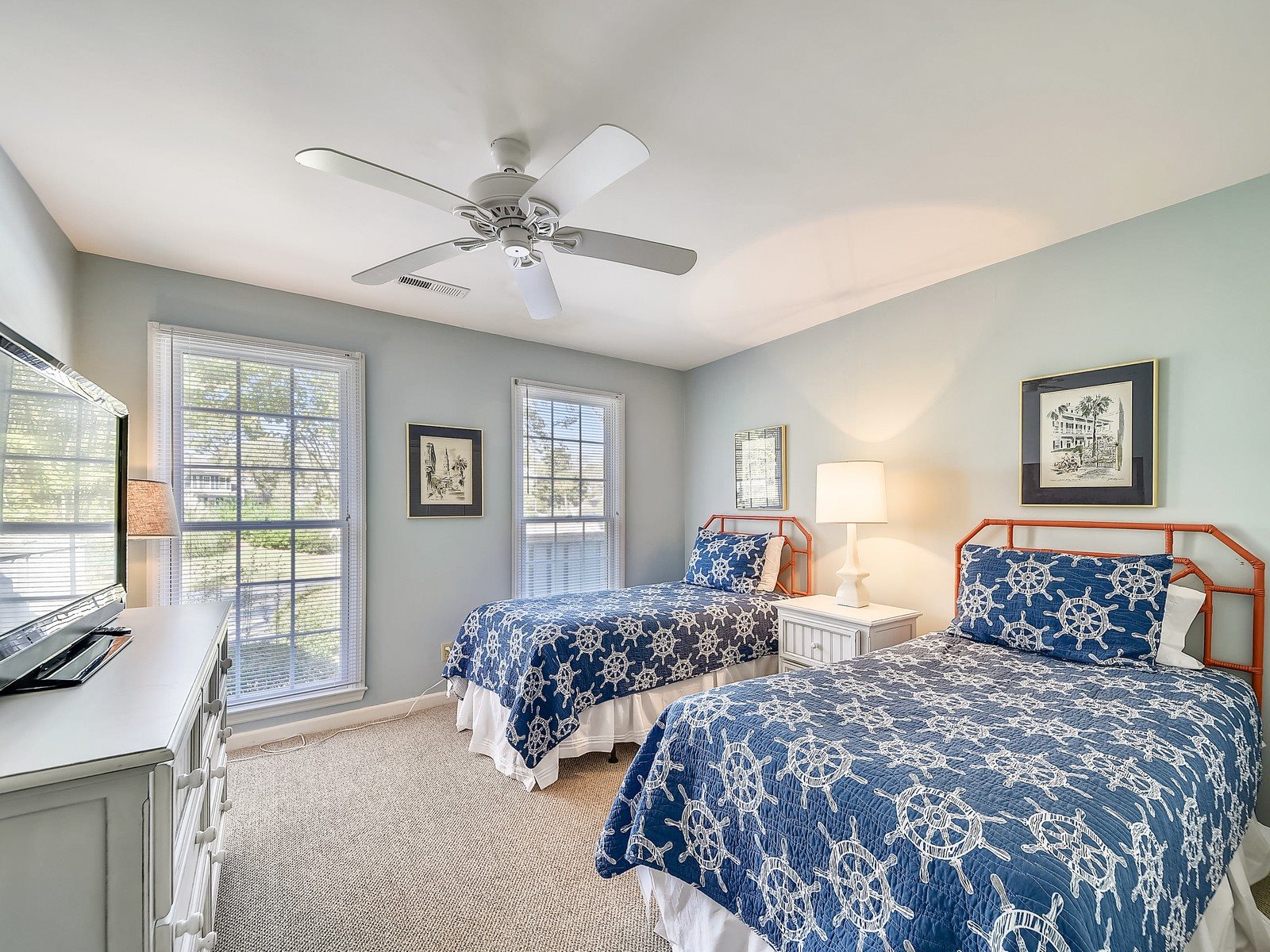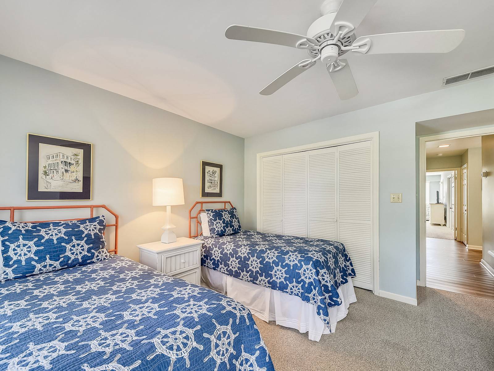 The downstairs also offers two carpeted bedrooms: a king bedroom with an accent chair and 42″ TV plus access to the screened-in porch and views of the Sound. This room has a private bath including double vanities and a walk-in shower. In the hall there is a bathroom with a single vanity and walk-in shower. Then a twin bedroom (2 twin beds) with a 37″ TV.