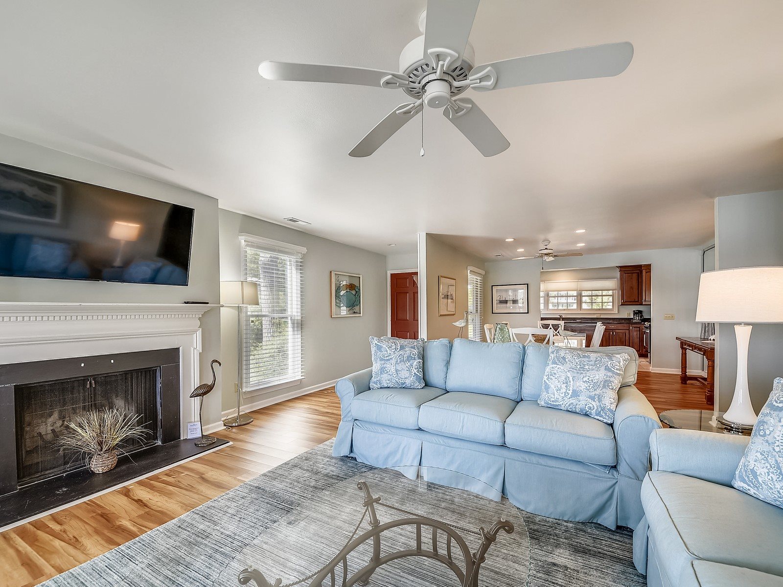 In the family room you will find new furniture including two light blue sofas, one accent chair and a 55″ Samsung flat screen TV mounted over the fireplace. The sliding glass doors open to the screened-in porch with ceiling fan, a round table that seats four plus two rocker chairs. Go down a few stairs to the large outdoor deck and BBQ on the Weber grill while watching sunsets, boats come and go or the dolphins playing in their natural habitat. The deck has bench seating and four Adirondack chairs.