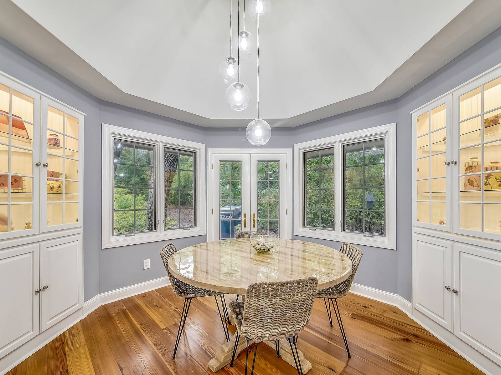The wraparound driveway and beautiful, lush landscaping welcomes you at the front of the house. As you enter this gorgeous home you are immediately greeted by coastal blue painted walls, the hardwood floors and the pitched white ceiling beams that open to a dining room with a table that seats four plus the bench seat. Just beyond the dining room, is the bright and open smaller living area with a couch, love seat and additional chair providing tons of room for family and friends. A great place to sit and talk or simply read a book. This room overlooks the pool deck. The sliding glass door leads you to the outside where there is an umbrella table that seats six, the beautiful pool with waterfall feature and spa, six lounge chairs and four Adirondack chairs. There is also a Char-Broil gas grill on the property and a private dock on the lagoon where you can go fishing! A great outdoor extension of the indoor living area.