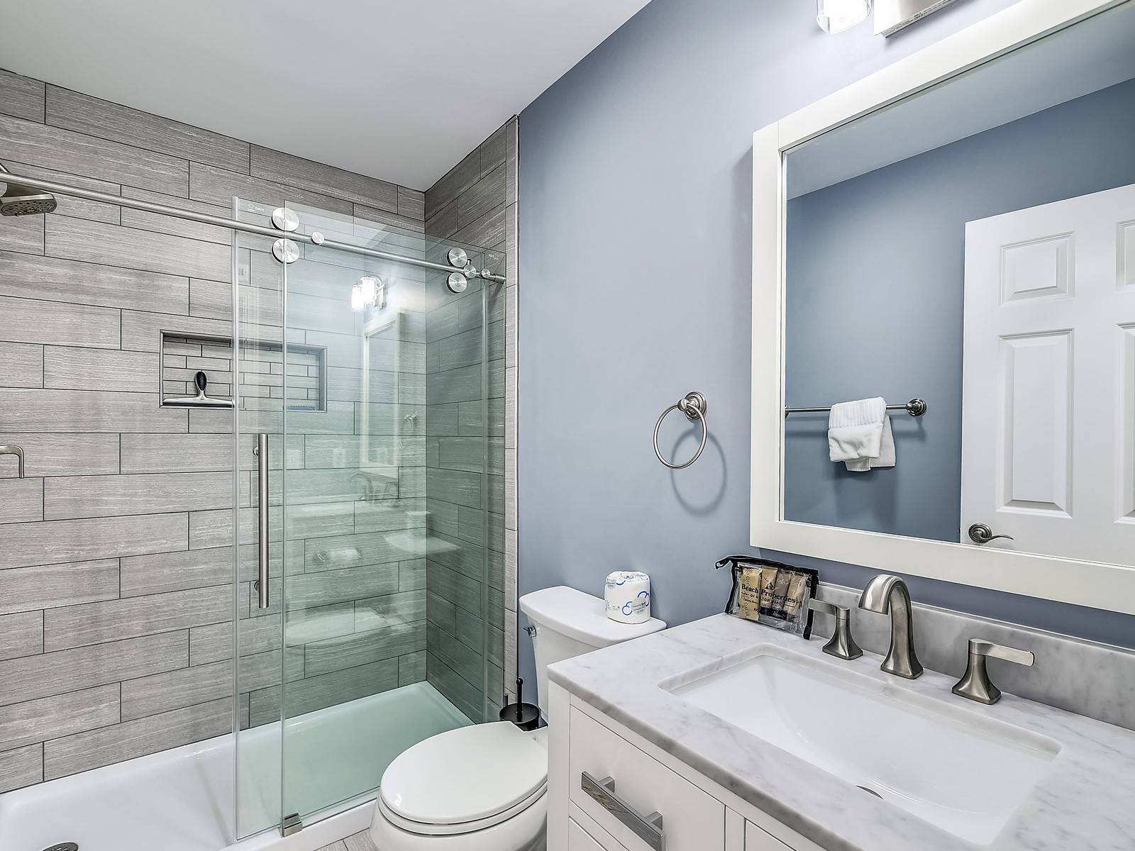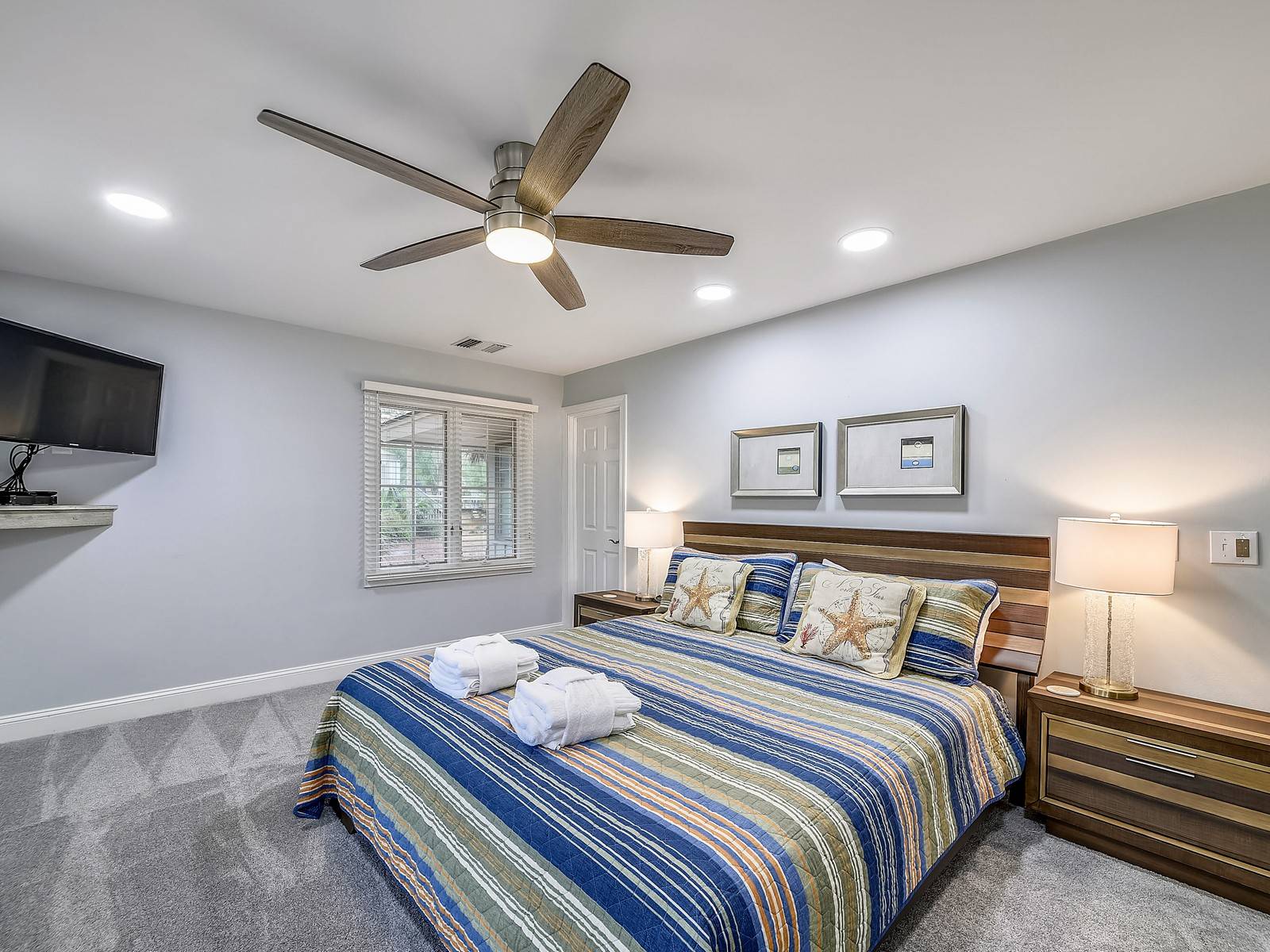 To the right is the main living room with a 60” Samsung SMART TV mounted over the fireplace, a large blue sectional sofa and lots of bright, natural sunlight – perfect for family gatherings. This living room has direct access to the back deck and pool! Behind the French style doors is another master bedroom with hardwood floors, king size bed, 40” TV and a private bathroom with a single vanity and walk-in shower.
