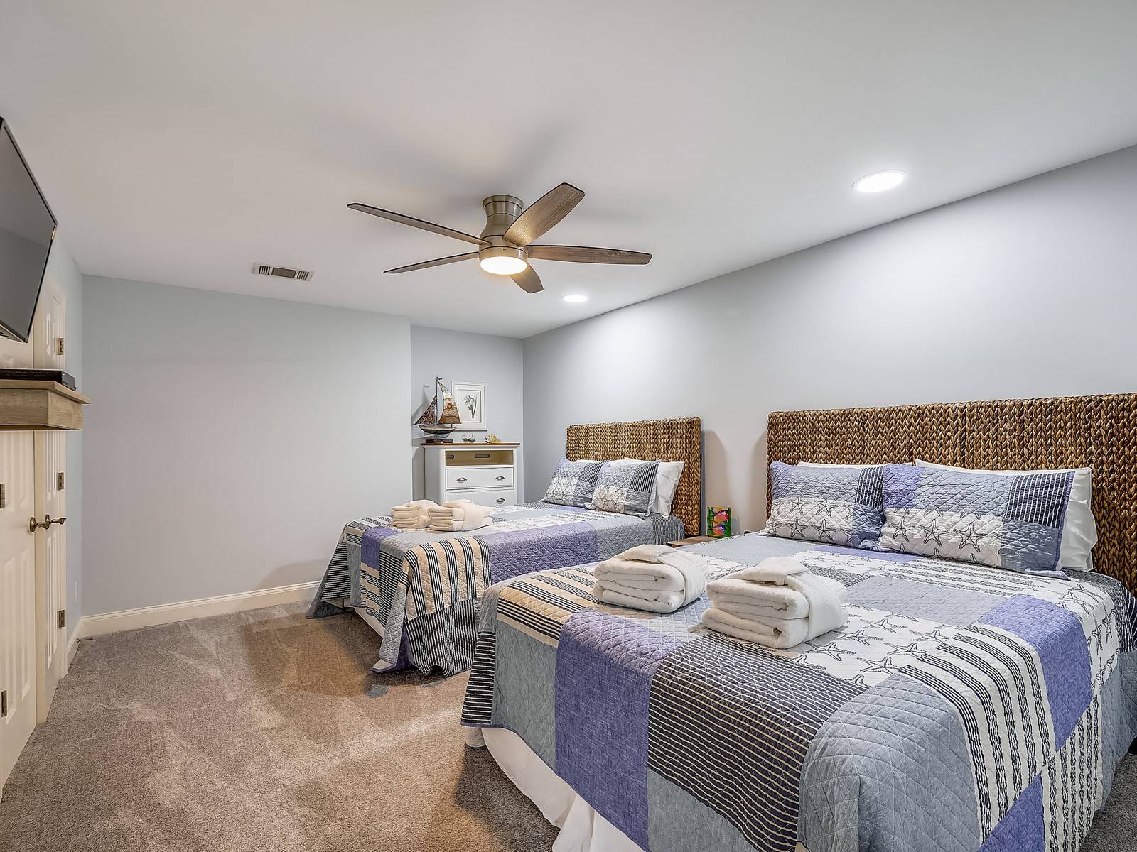 As you walk past the kitchen, there is a laundry room with a washer, dryer, and sink. The next room is a guest bedroom with two twin beds, a 32” TV and its own bathroom with double sinks and a shower/tub combo. Following this room is a guest bathroom with a walk-in shower that also has a connecting door to the next bedroom which has two double beds. The last room down this hall is a giant play room with a 55” Samsung TV, couch, two huge bean bag chairs, and a gaming center with small monitor and game chair. There are twin bunk beds plus two pyramid bunk beds (twin over full). This is the perfect play area for the kids to have some downtime while the adults get some too! The garage connects to this wonderful play room and has a fridge and sink plus offers a ping pong table, foosball table and corn hole game for some friendly family competition and your enjoyment.