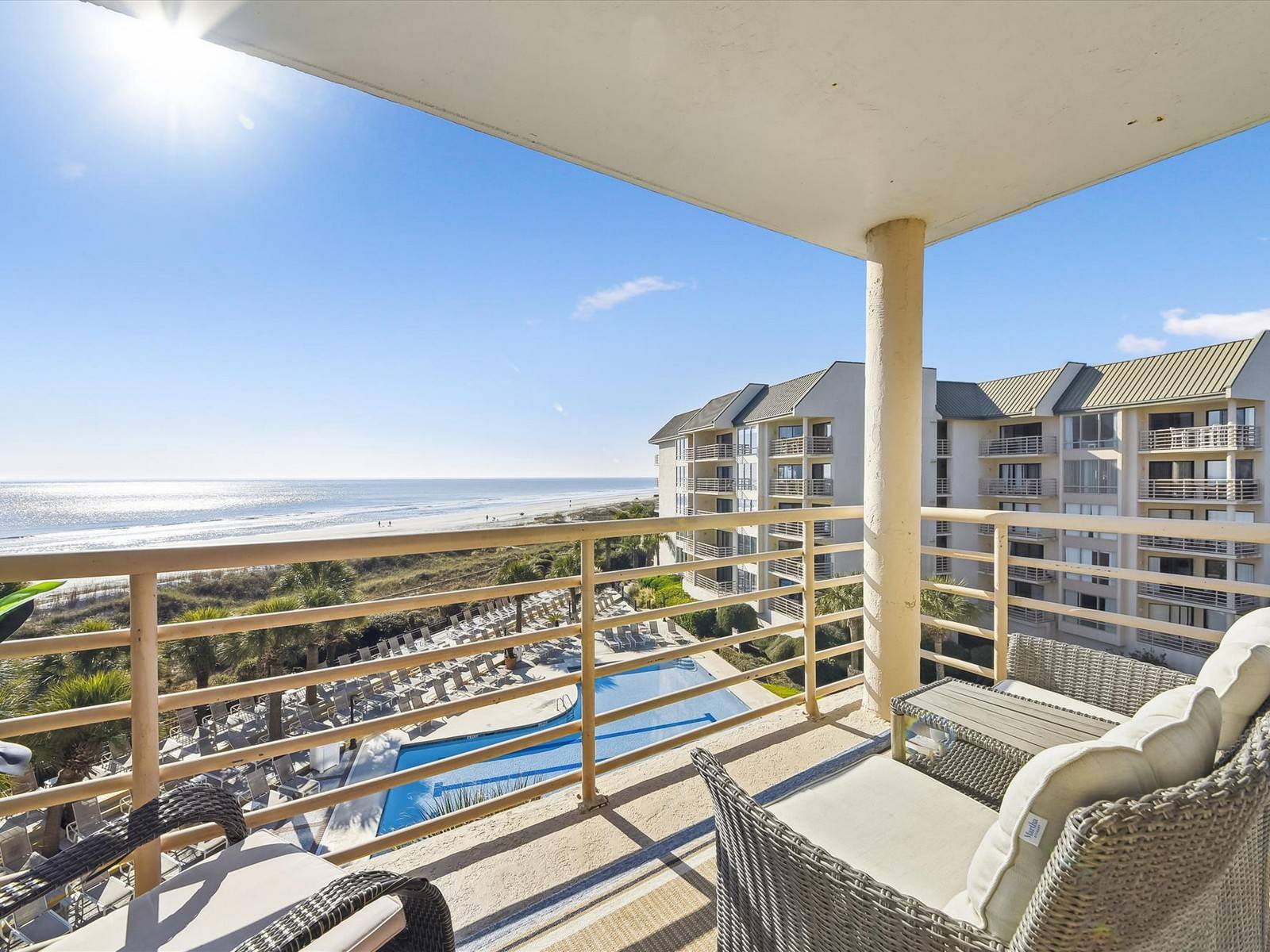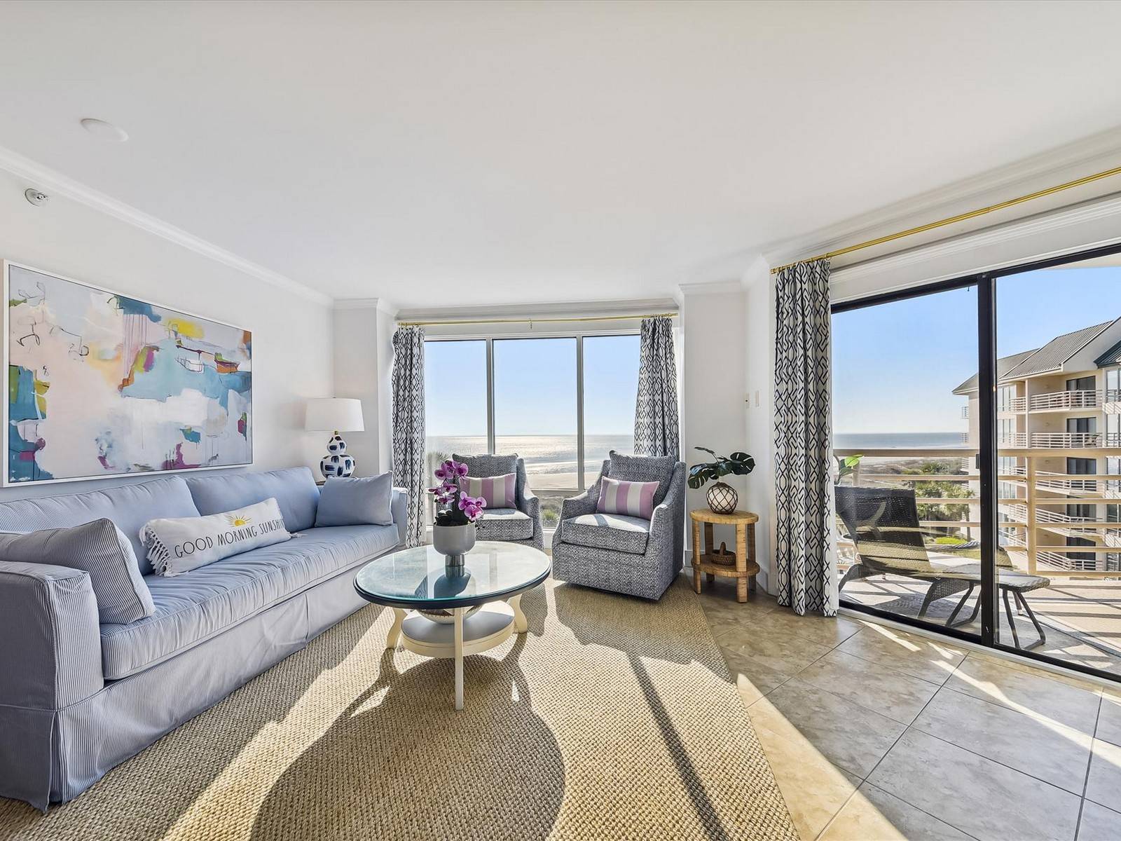 The living room, dining area and both balconies offer magnificent oceanfront views. The balcony off the living room is shared with the master bedroom. There is a table and three chairs to sit with a glass of iced tea and watch the dolphins play. The living room has a Queen sleeper sofa and two very comfortable chairs facing a 42†flat screen TV hung on the wall. New artwork, area rugs & curtains help to make this a truly coastal chic getaway for you and your family and friends!