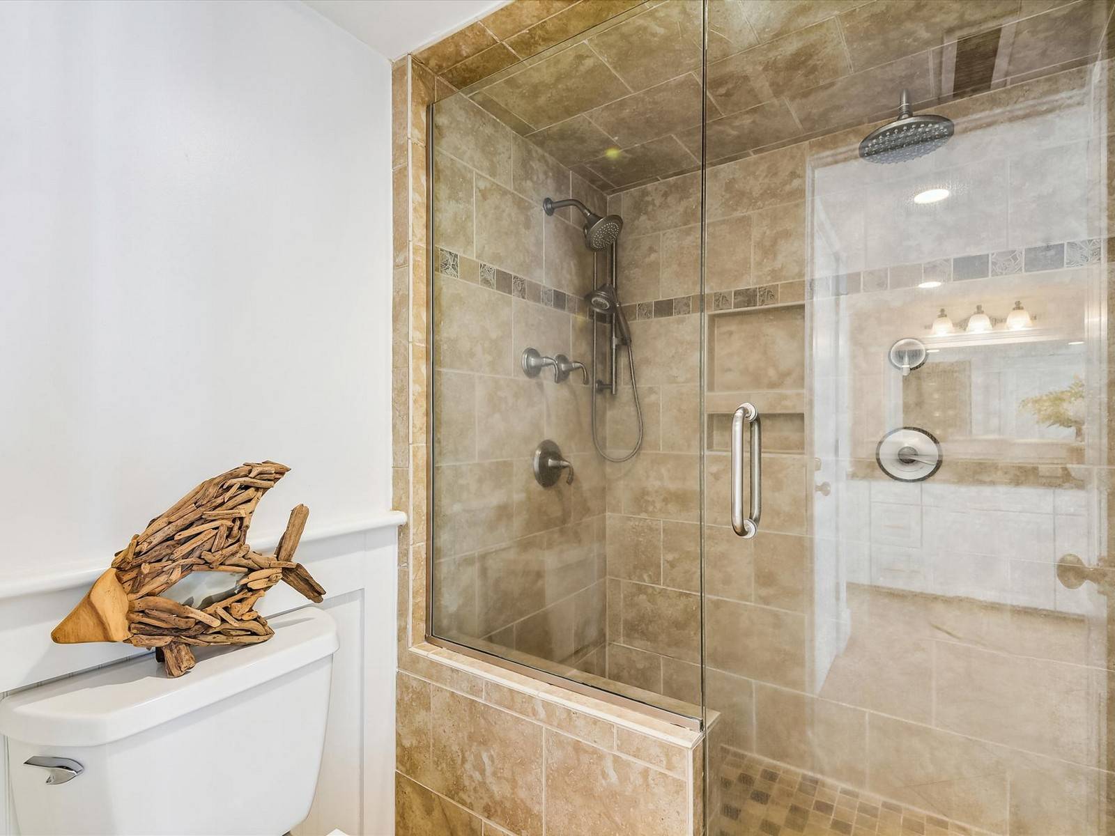 The bedrooms have great separation all new bedding effective 1/2/2020. The king master bedroom is located on the right side of the dining room and is decorated in rich earth tones featuring a 26†flat screen TV and a private bath. The bath has an ornate walnut double vanity and a shower with three heads. The sliding glass door from this bedroom leads to the balcony shared with the living room and has a striking view of the ocean and the pool.