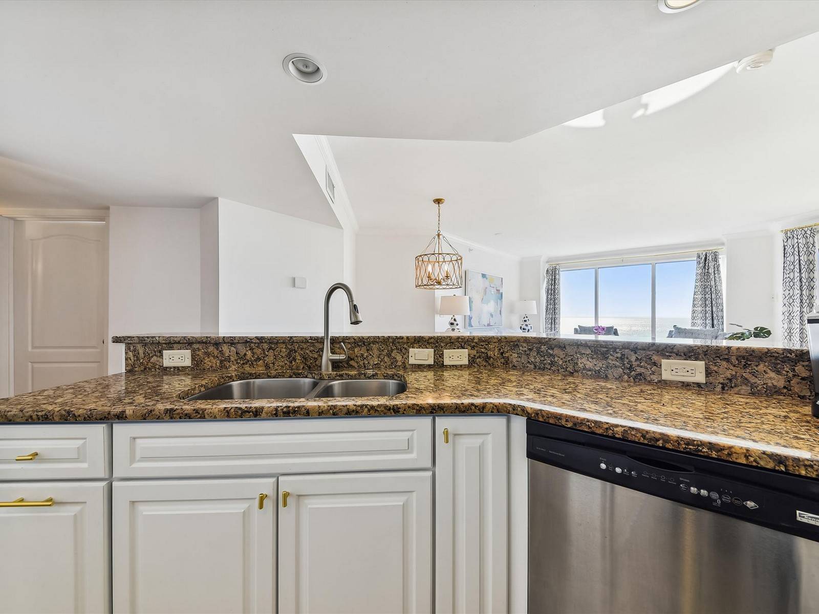 1401 Villamare is a completely renovated 4th floor villa with breathtaking oceanfront views. When entering this villa the main living area, kitchen, dining and master bedroom are to your right. The new kitchen has been completely renovated with stainless appliances, granite counters and walnut cabinets. There is a granite breakfast bar that seats four. A washer and dryer are conveniently located in the kitchen. The dining room has a gorgeous walnut table with six seats.