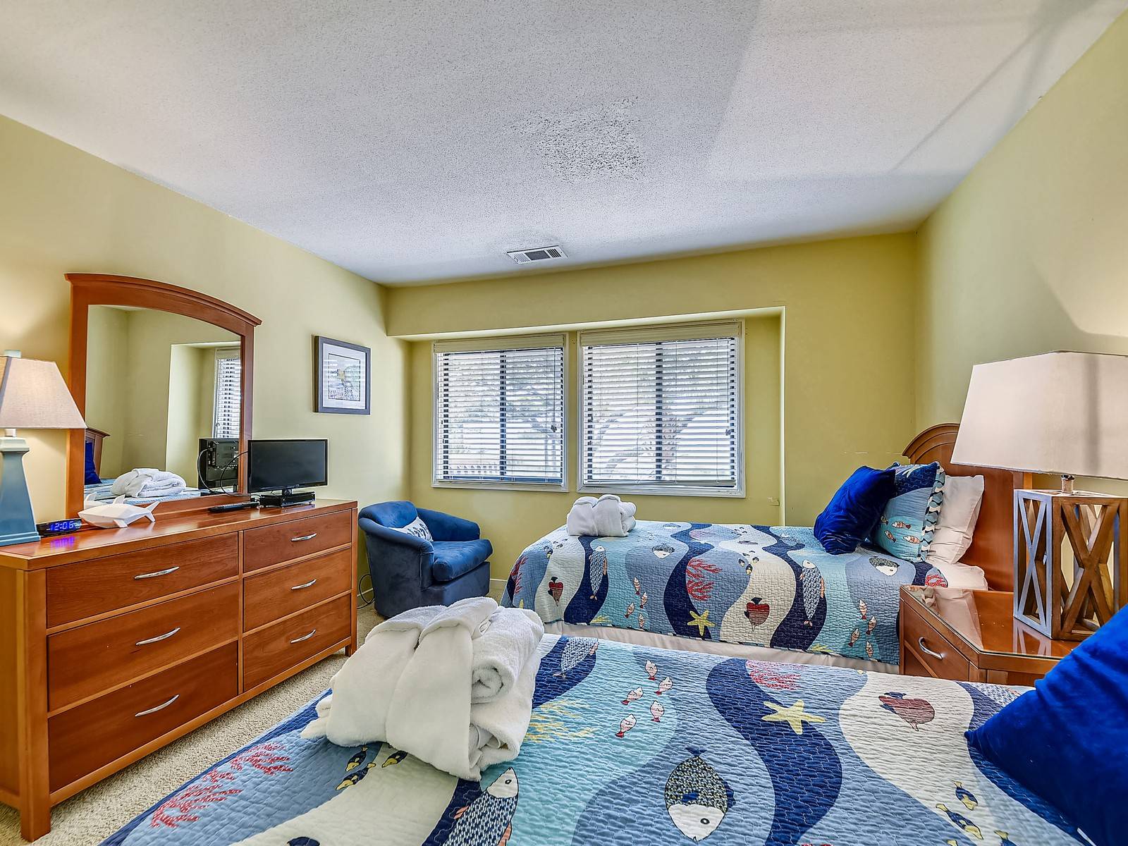 The upstairs master bedroom has a TV, king bed, and a spacious, private, renovated bath with a double vanity, a separate water closet and a combination tub/shower. A private balcony provides a fantastic view of both the Calibogue Sound and the Atlantic Ocean. A second king bedroom upstairs shares a hall bathroom with shower only with a bedroom with 2 twin beds. Guests are sure to have a memorable vacation in this lovely villa.
