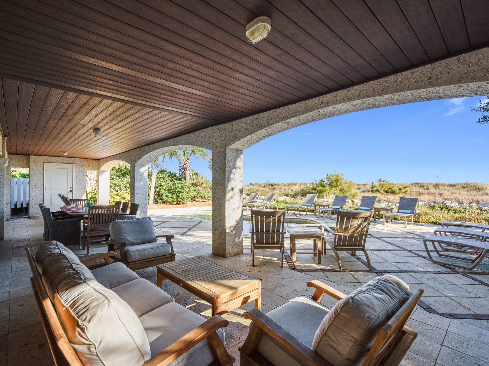 As soon as you enter this home you can see the ocean from the wall of windows. 15 Dune Lane is an oceanfront 5 bedroom, 7 bath home that offers a stunning design, magnificent views, and is picture-perfect in every way! Luxury features with direct ocean views from just about every room. Relax on the spacious screened in porch. Deck access can be found from most bedrooms and living spaces. A beautiful pool and spa area lead you to your private beach access. There are two driveways and a car port under the house that offers you plenty of parking. There is also a ping pong table down there for your family’s entertainment.