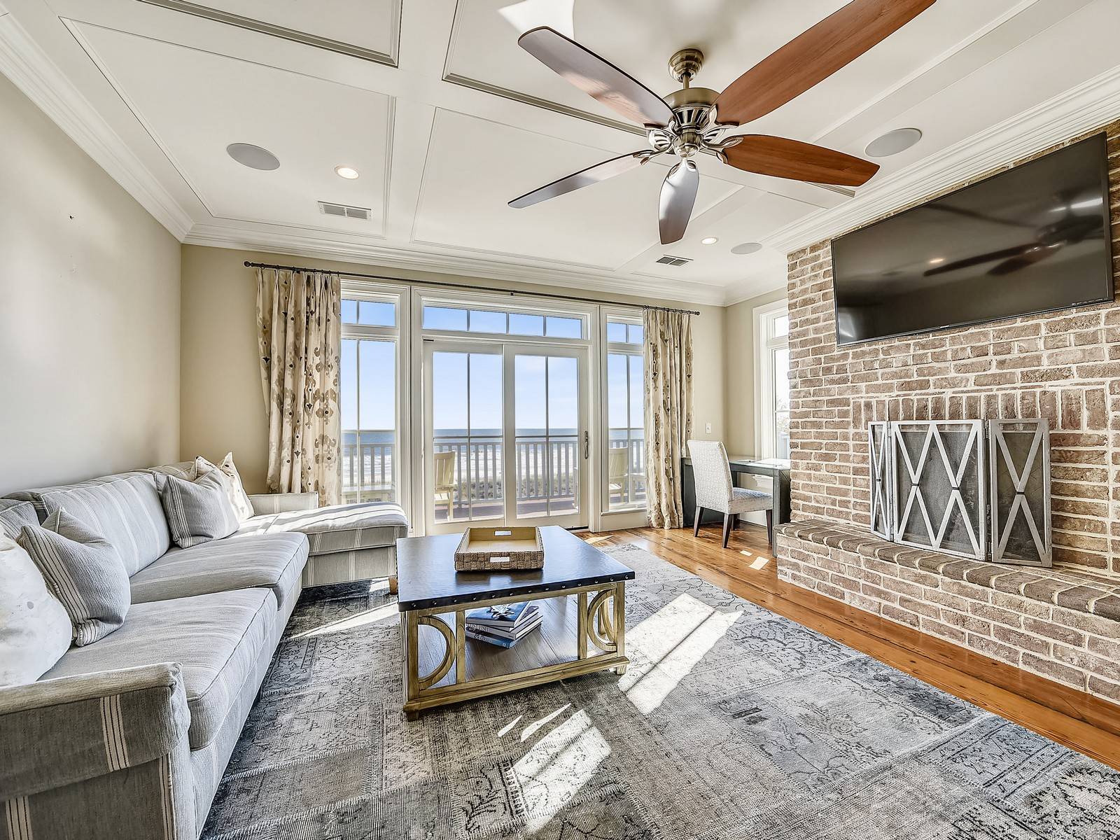 Finally at the end of this hallway is a sitting area with beautiful views of the ocean and access to the 2nd floor deck. There is a bar with sink and a bar island with 3 stools. There is an L-shaped couch with accent chair, another desk for you to utilize to catch up on emails or maybe do some work all while enjoying the sights and sounds of the ocean. A nice fireplace with 60” wall mounted Sharp TV.