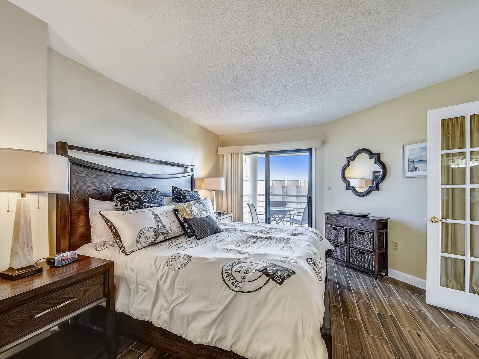Guests will enjoy the open concept for the main living area that offers great ocean views. The kitchen has tiled countertop and floors with white appliances. The stackable washer and dryer are in a closet in the kitchen. The kitchen comes fully equipped for preparing meals. The dining room is located near the kitchen, with a mirrored accent wall, and a round glass top table with seating for five. The living room has a tan microsuede dual reclining sofa with a matching love seat that also reclines and a 48″ TV. The sliding door opens to a covered balcony where there is a table for three. Enjoy the ocean breeze and views while sipping on a cocktail or having a meal.