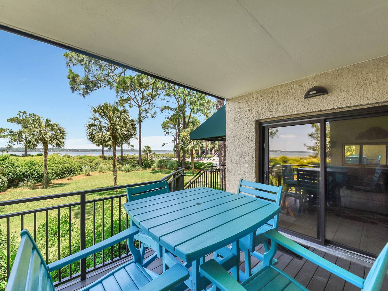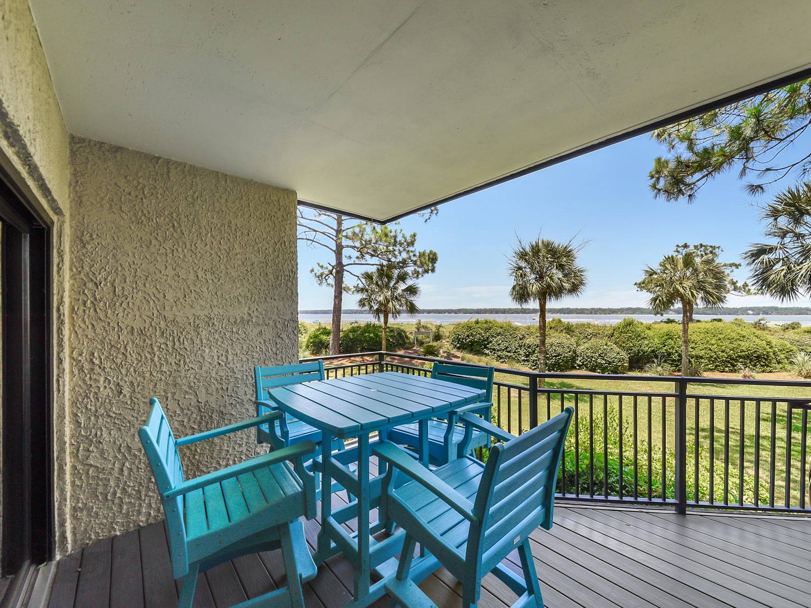 The fully equipped kitchen has beautiful cabinetry, new appliances, and a breakfast bar that seats four. The adjacent dining high top table seats four also. To the left of the entrance in the closet is a stacked front-loading washer and dryer. Behind the pocket door is a bathroom with a double vanity and walk-in shower. Off the kitchen is the guest bedroom with two queen beds, a walk-in closet and 40″ TV. The sliding doors open to a covered balcony with a high-top table that seats four. Enjoy your morning coffee while looking at the perfectly landscaped yard and Calibogue Sound.
