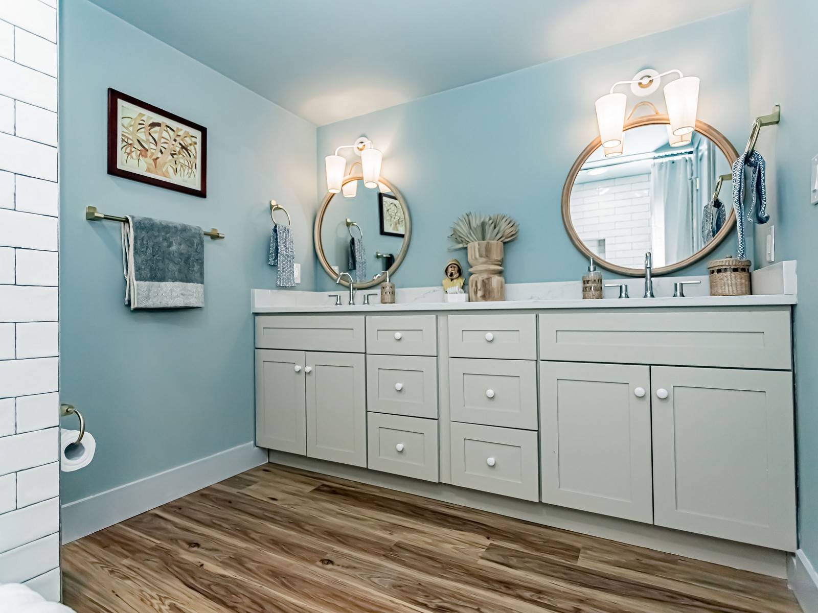 To the left of the entrance is the fully equipped kitchen with stunning granite counters, almost looks like beach sand, stainless steel appliances, off-white cabinets, and four stools at the countertop. The dining room has an oval table that seats six. In the living room you will find a gray sleeper sofa, two pink chairs and a mounted 55″ TV. All the natural light streaming in from the windows brightens up the entire villa and offers a beautiful view of the Sound, the landscaped yard and pool! Outside the living room is a wraparound covered balcony that has two chairs and a small table on one side and a patio love seat and white wrought iron table that seats four on the other side. This is a great place to start your day with a cup of coffee and end it with a glass of wine. The famous Hilton Head sunsets can be enjoyed from the balcony as well.