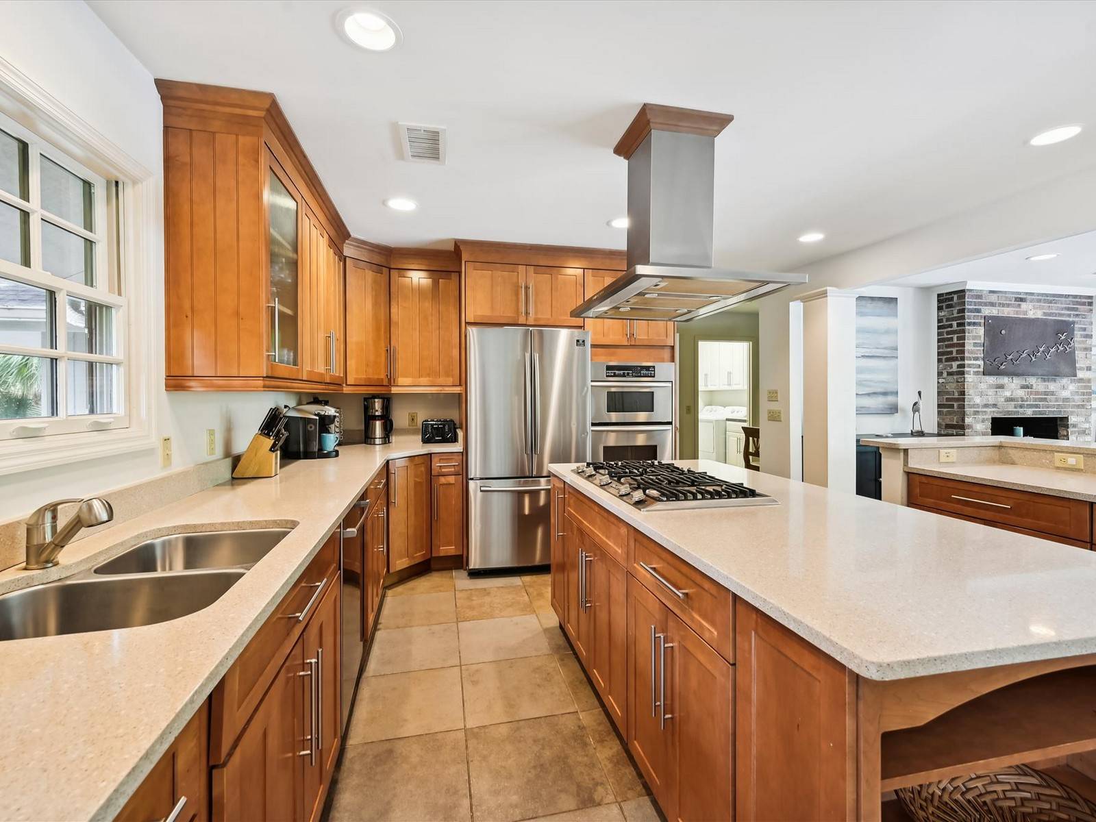 20 Baynard Cove is a spacious, single-level home in the prestigious Sea Pines Plantation, perfect for a relaxed Hilton Head getaway. The layout is open and bright, with views of the private waterfall pool from nearly every room. The gourmet kitchen is fully equipped with stainless steel appliances, a gas island cooktop, and a nearby half bath. The adjacent dining area features ample seating and a cozy bay window nook for casual meals or morning coffee.