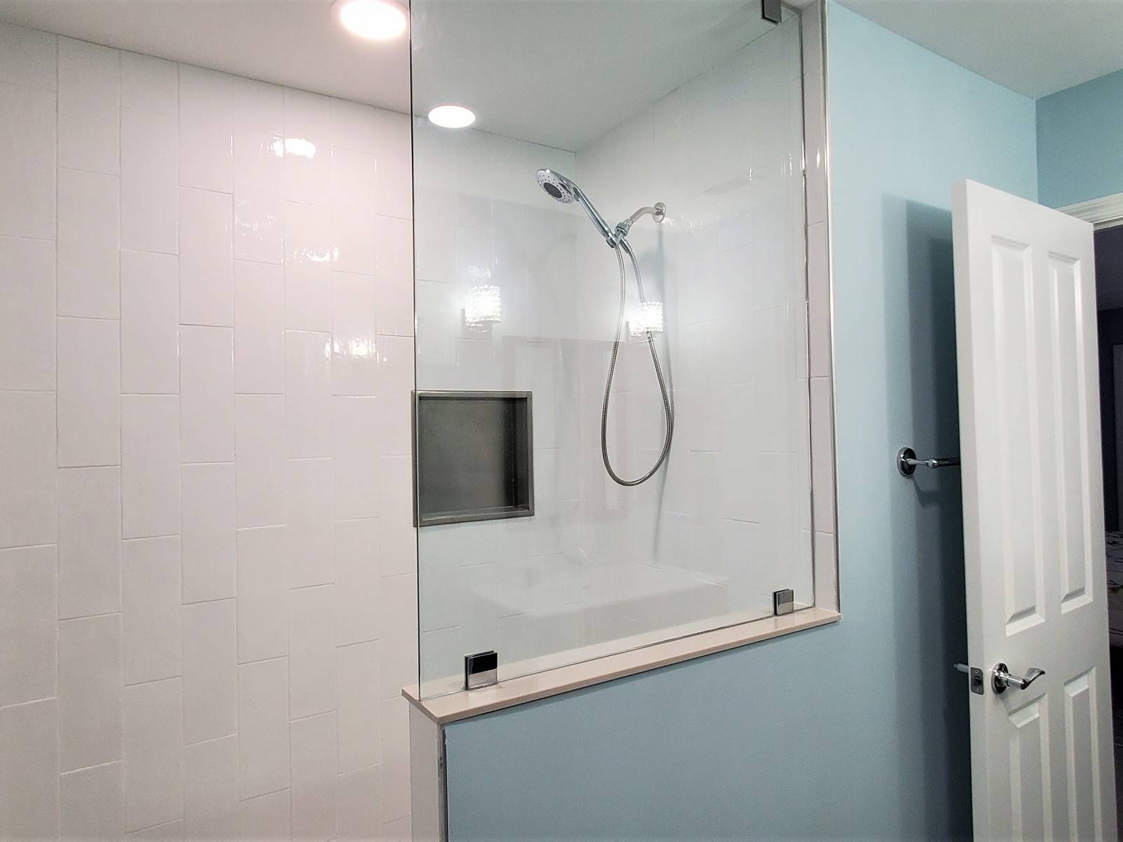The living room offers plenty of seating for easy conversation, while the adjoining den has a wall-mounted TV and DVR, ideal for movie nights or catching up on shows. The primary suite, located off the kitchen, includes a king bed, flat-screen TV, ceiling fan, and a modern en-suite bath with a walk-in shower. A sliding door opens to the back deck and pool area.