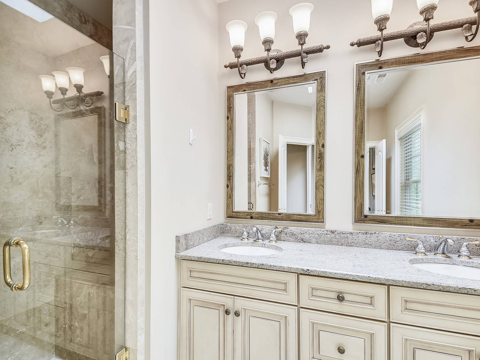 There are four more bedrooms located on the second level. At the top of the stairs to the left is a king bedroom with accent chair and 32” TV in the armoire. This room has a private bathroom with a granite topped double vanity and a tub/shower combo. The next room has a queen bed, chair, 32” TV and a private bathroom with a granite double vanity and walk-in shower. To the right of the stairs in the hall is the laundry room with a sink, washer and dryer. The next bedroom has two twin over twin bunk beds, a 32” TV and a private bath with a granite single vanity and walk-in shower. The last bedroom is a very large master suite with a king bed, chair, 40” TV and large walk-in closet. The en suite bathroom has a granite double vanity and walk-in shower.