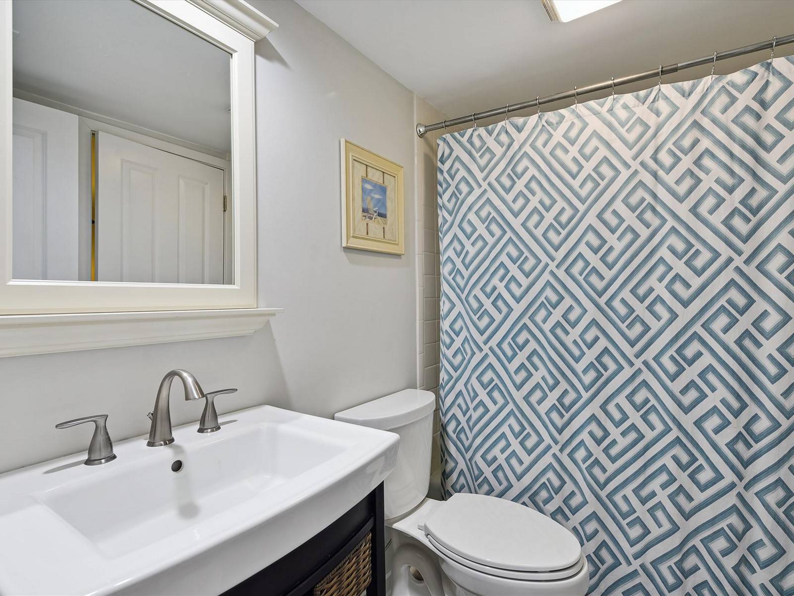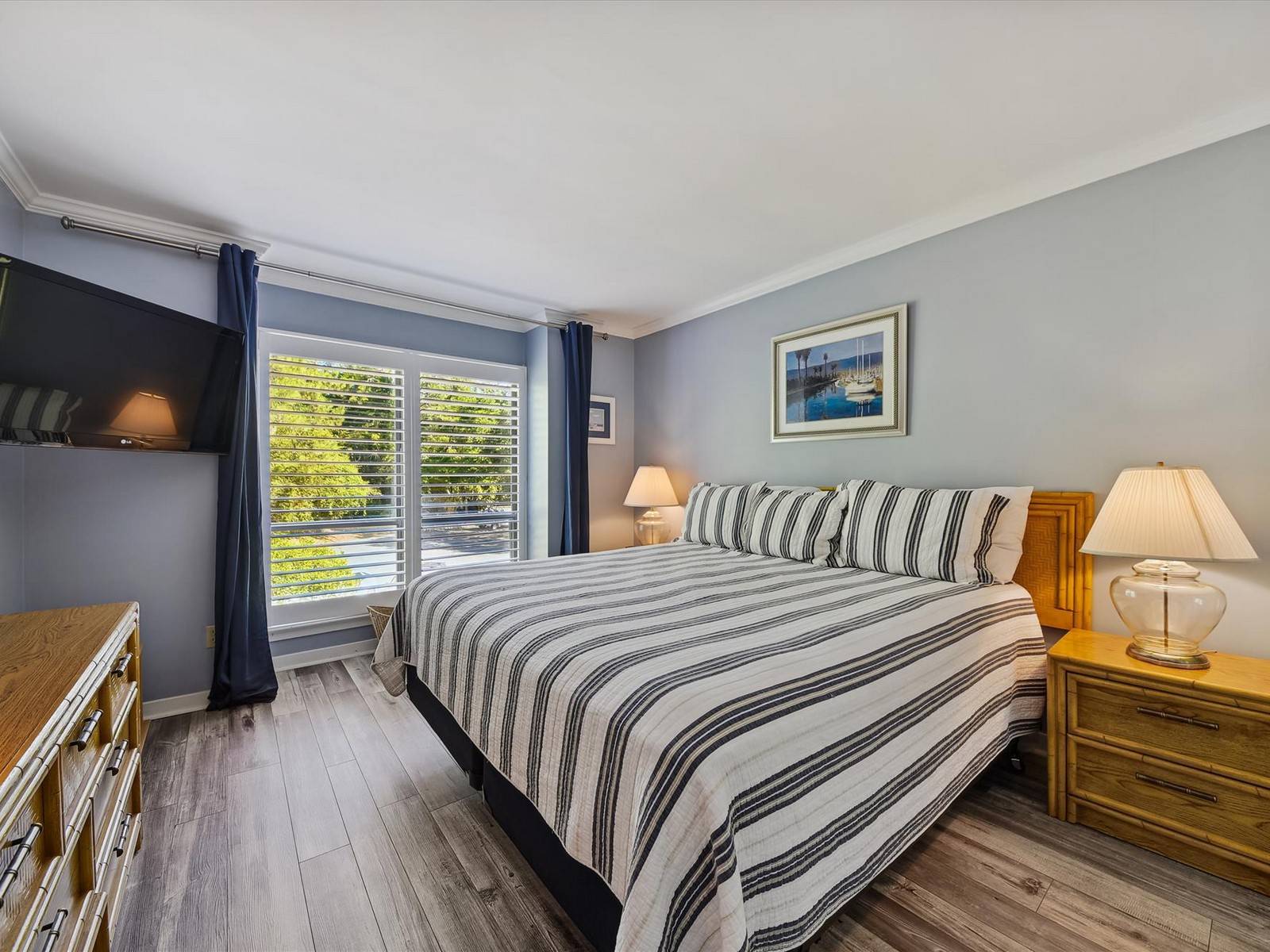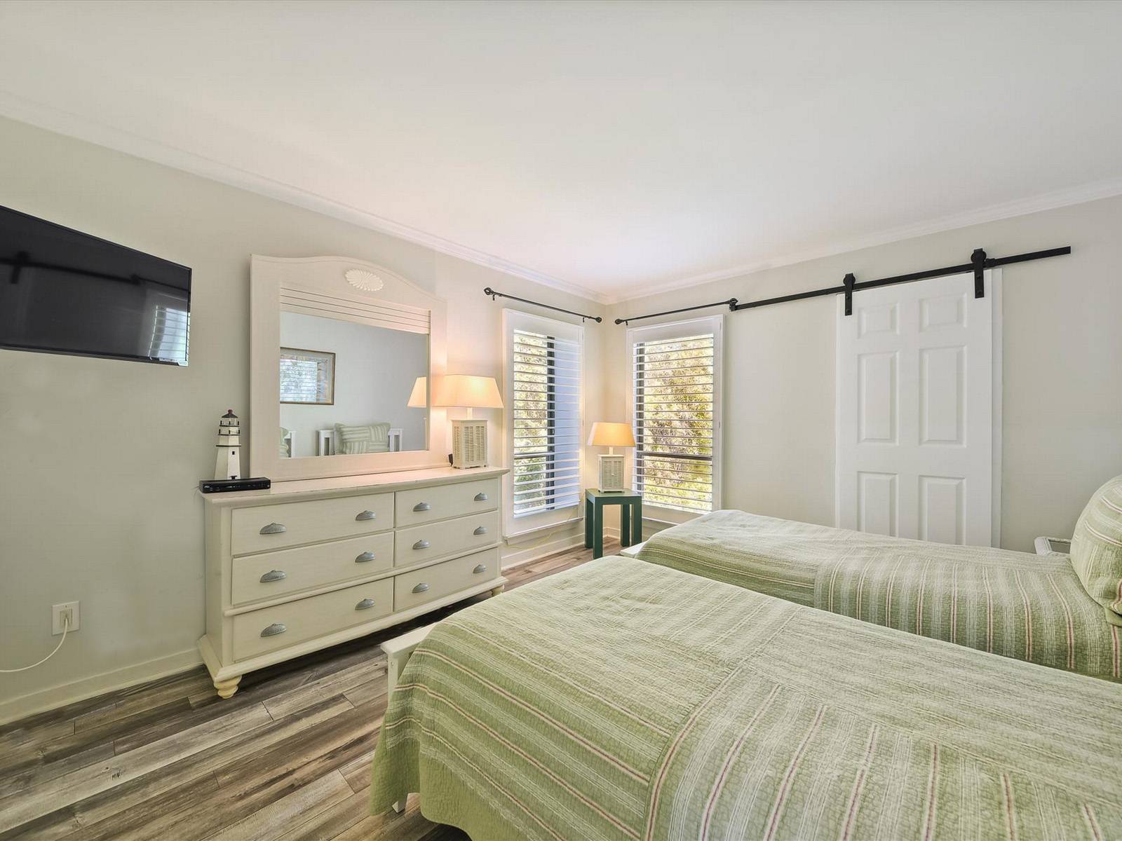 Down the hall are the 2 bedrooms, the 1st one on the left has 2 twins (1 w/ trundle), 32″ SMART TV and an attached bathroom with walk-in shower. The master on the right has a king bed, 42″ TV and an attached master bath with a brand new renovated walk-in shower.