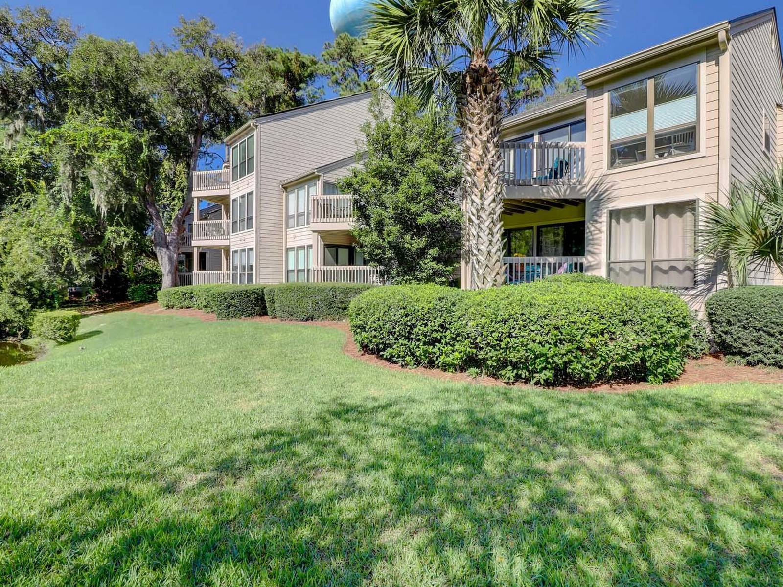The living and dining areas both have sliding doors that go out to a relaxing balcony that overlooks a lagoon and beautiful oak trees draped with the Spanish Moss that is indigenous to the low country.