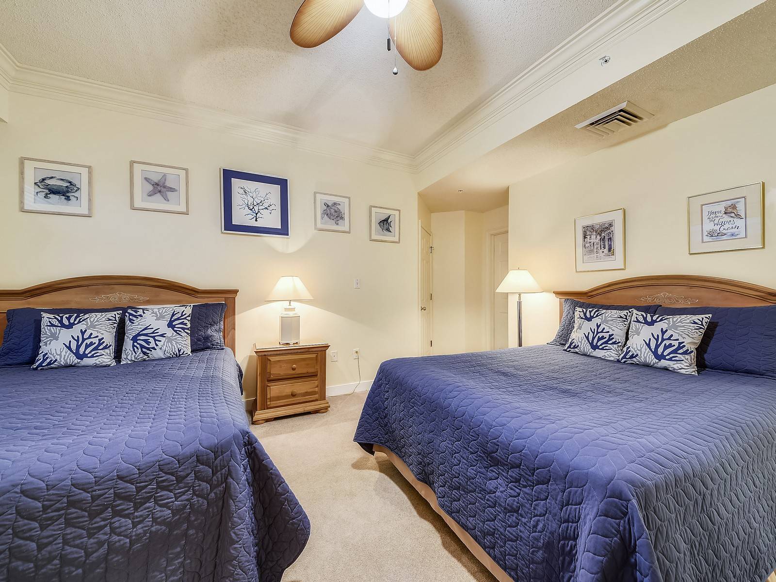 The guest bedroom is to the left of the foyer. It is carpeted and has two queen beds, a chair, walk-in closet, and a 32” TV in the armoire. The bathroom is shared with the hall and has light green walls, double granite vanities, a soaking tub, and a walk-in shower.