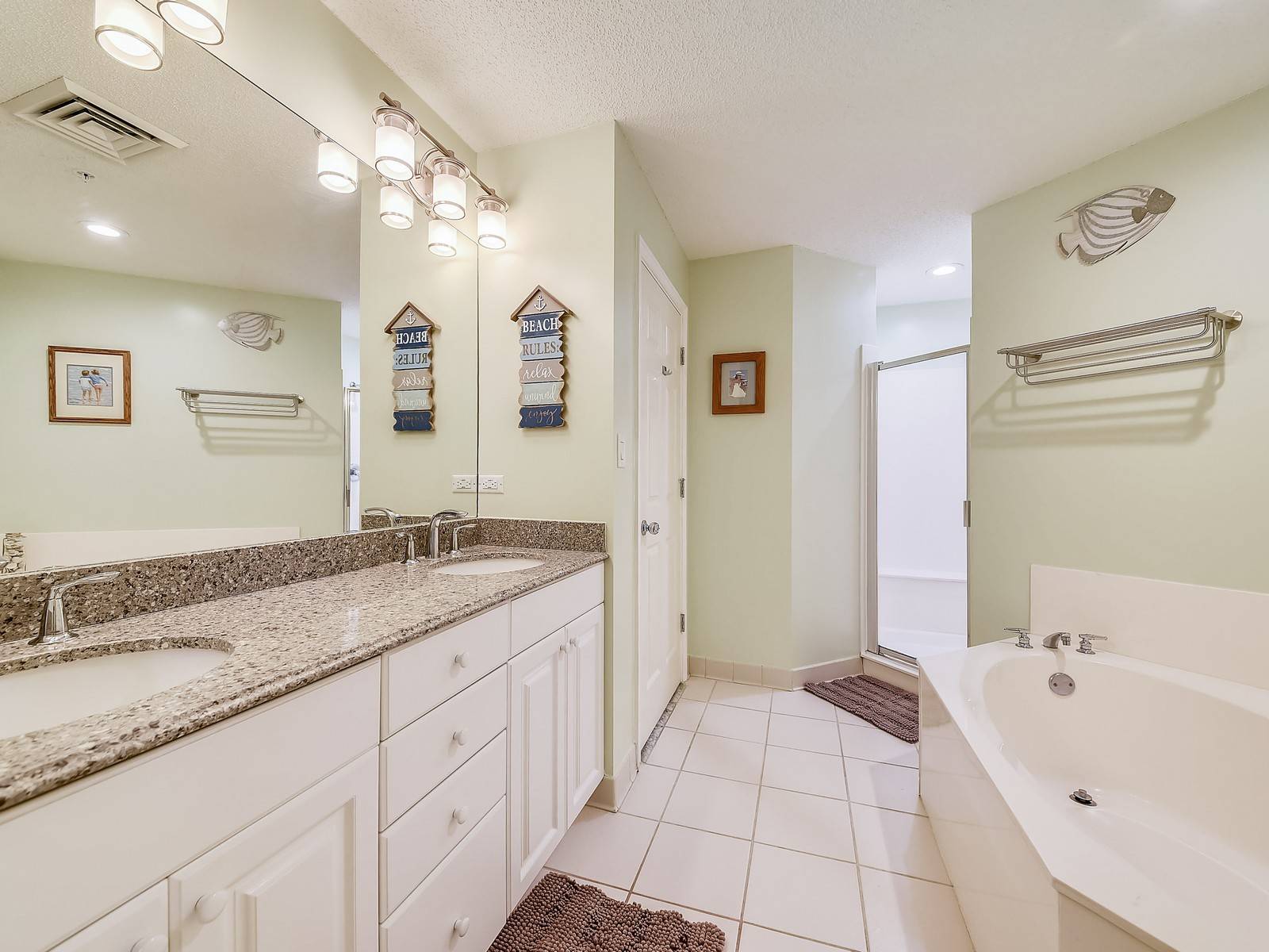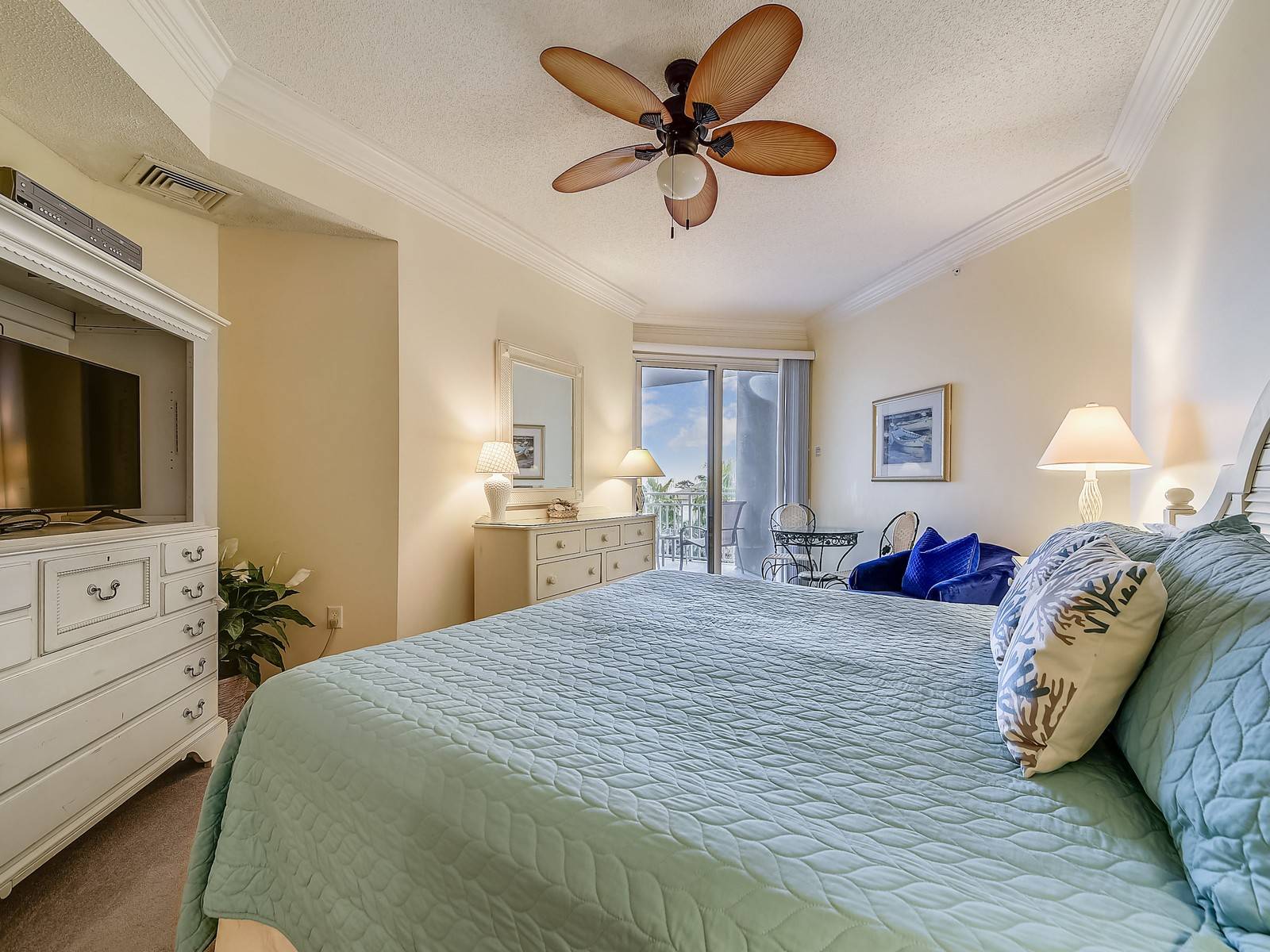 The Master bedroom is located to the right of the foyer. It is carpeted and has a King bed, two blue comfortable chairs, a small café style table for two, and a 40” TV. This room has a private covered balcony with four chairs. The perfect place to enjoy your morning coffee! The master bathroom has aqua blue walls, double granite vanities, a soaking tub, and a walk-in shower.