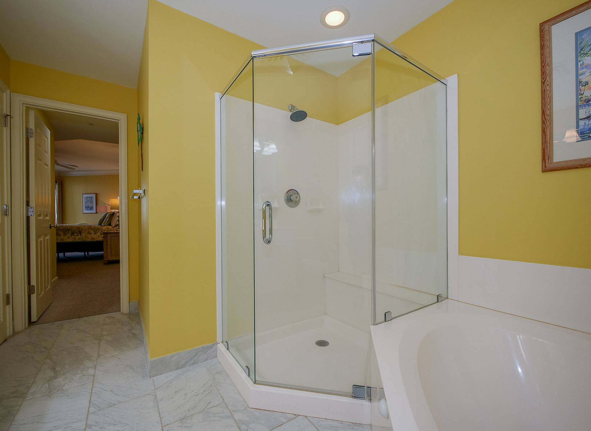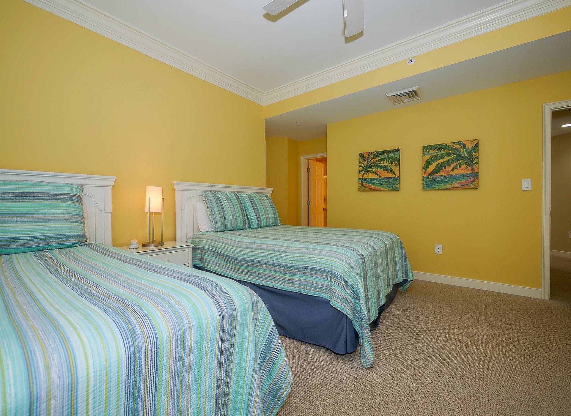 The master bedroom is to the right of the foyer. It features a king bed, chair, tropical theme painted dresser, walk-in closet, and a 43” TV. The sliding door opens to the covered balcony with two chairs and beautiful ocean views. The private bathroom has double sinks, a soaking tub, and a walk-in shower. The guest bedroom is to the left of the foyer and features two queen beds, a walk-in closet, and a 40” TV. The adjoining bathroom has a large soaking tub, double vanity, a separate shower with seat, and has shared access with the hall. Both bedrooms are done in light, bright colors, along with Berber carpeting.