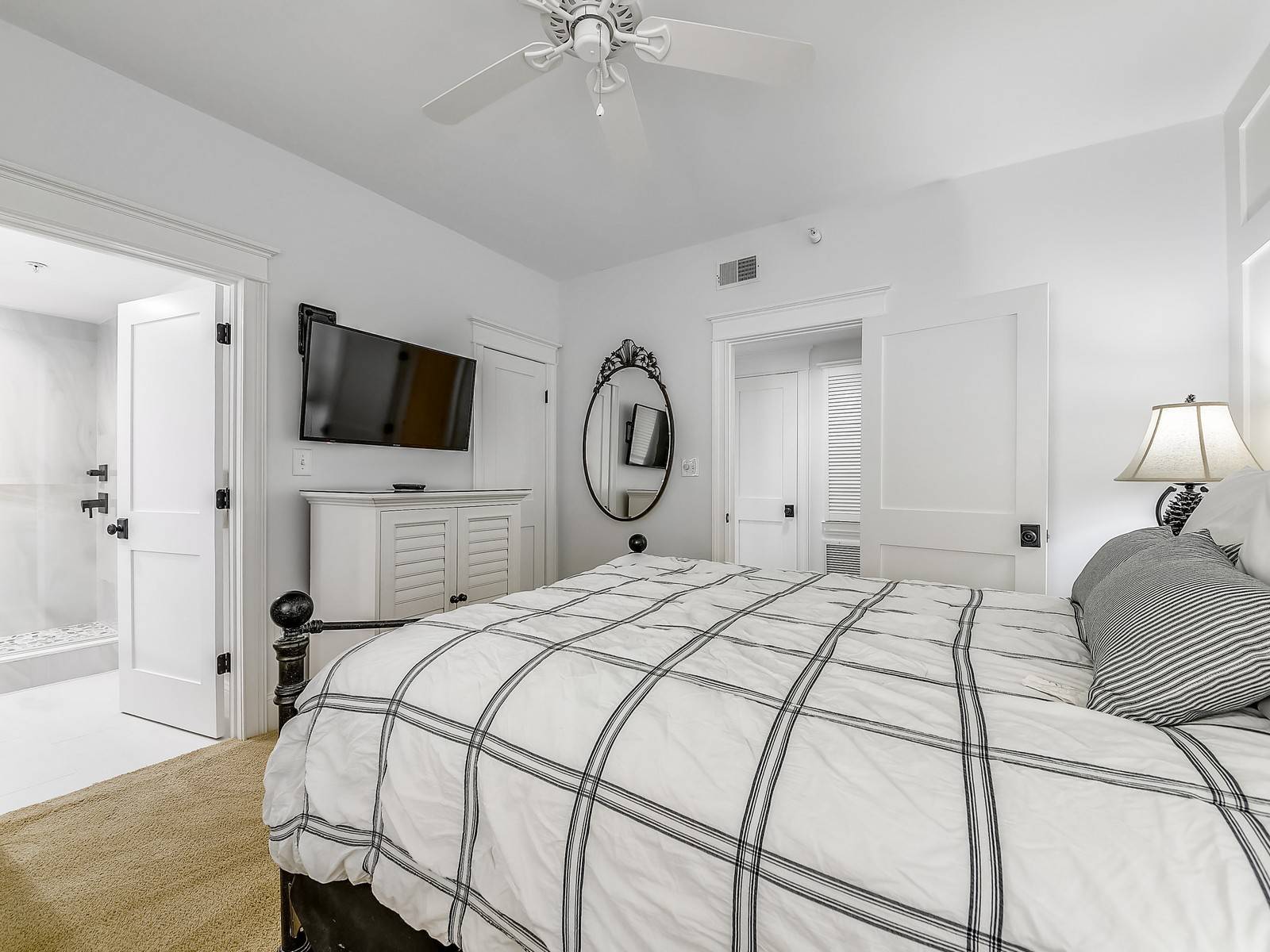 To the right of the entrance is a carpeted bedroom with a queen sleigh bed, accent chair and mounted 32″ TV. This room has a private bathroom with a single vanity and walk-in shower. The next bedroom down the hall has a king bed and 32″ TV. This room has beautiful ocean views and access to the balcony. The private bath has a single vanity and walk-in shower. Down the hall to the left is another bedroom with a queen size bed, 43″ TV and private bath with single vanity and walk-in shower.
