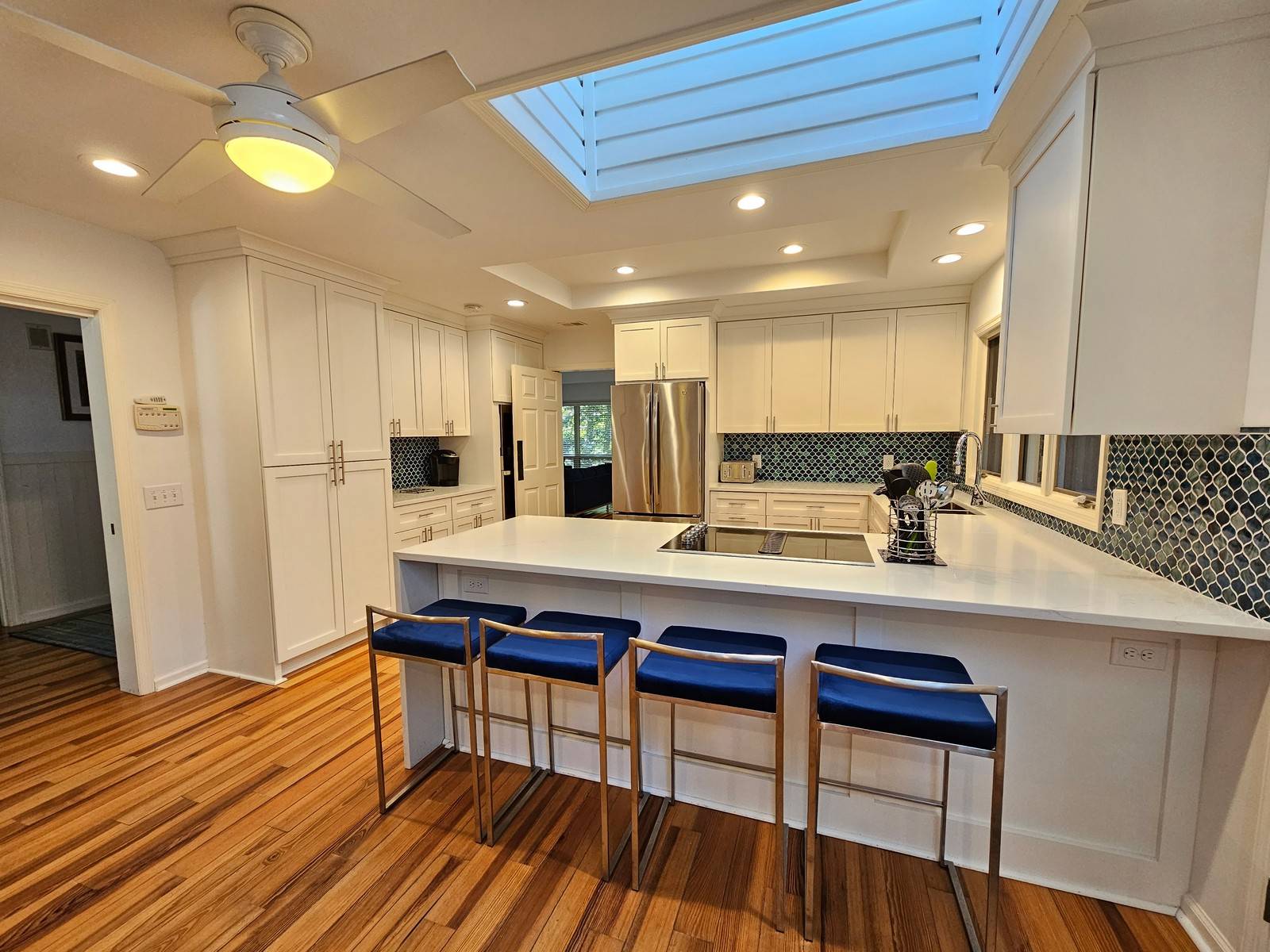 The fully-equipped kitchen is to the right as you enter and is very open with several skylights. It features a breakfast bar that seats three and an eat-in kitchen table that seats four with access to the back deck. There is also a sleeper sofa in this room that can be used for additional guests.