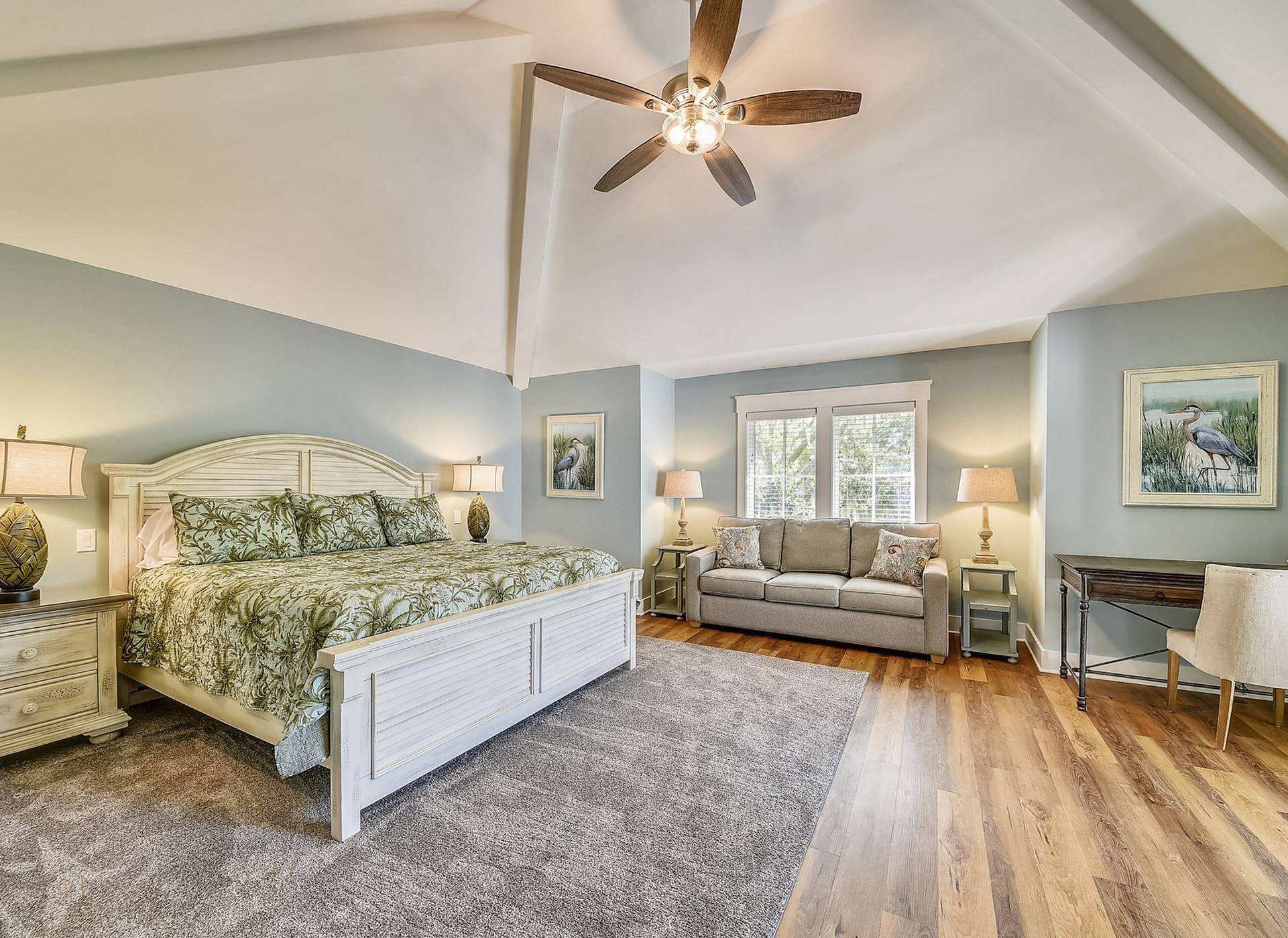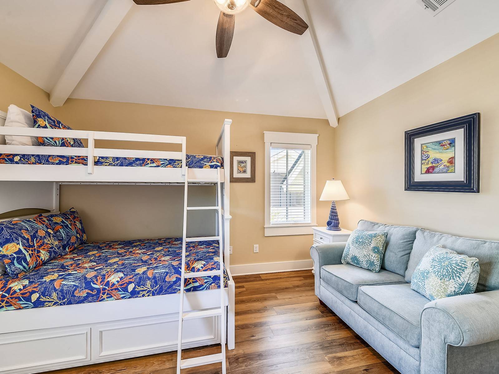 Up 18 stairs to the second floor are the additional 5 bedrooms and another formal living room with an L-shaped couch, 2 chairs and a mounted 58″ SMART TV. There is a kitchenette that has a microwave, mini fridge and sink. Access to the covered deck is available from the living room. Bedroom #3, at the top of the stairs to the right, has a twin over full bunk bed with trundle, a love seat and mounted 42″ SMART TV. There is a shared bathroom with Bedroom #4 that has a single vanity and tub/shower combo. Bedroom #4 has a queen bed and 42″ SMART TV. To the left of the stairs, you will find a bathroom with 2 single vanities, a walk-in shower and large walk-in closet. Bedroom #5 has a king bed, desk, queen sleeper sofa and a mounted 58″ SMART TV. There is access to the outdoor deck overlooking the pool. This deck is covered with ceiling fans and 4 rocking chairs so you can really get into the low-country spirit of relaxing! Bedrooms #6 & 7 both have queen beds and 42″ SMART TVs and share a bathroom with a single vanity and walk-in shower. From bedroom #7 there is access to a small, covered deck with ceiling fan and 2 rocking chairs.