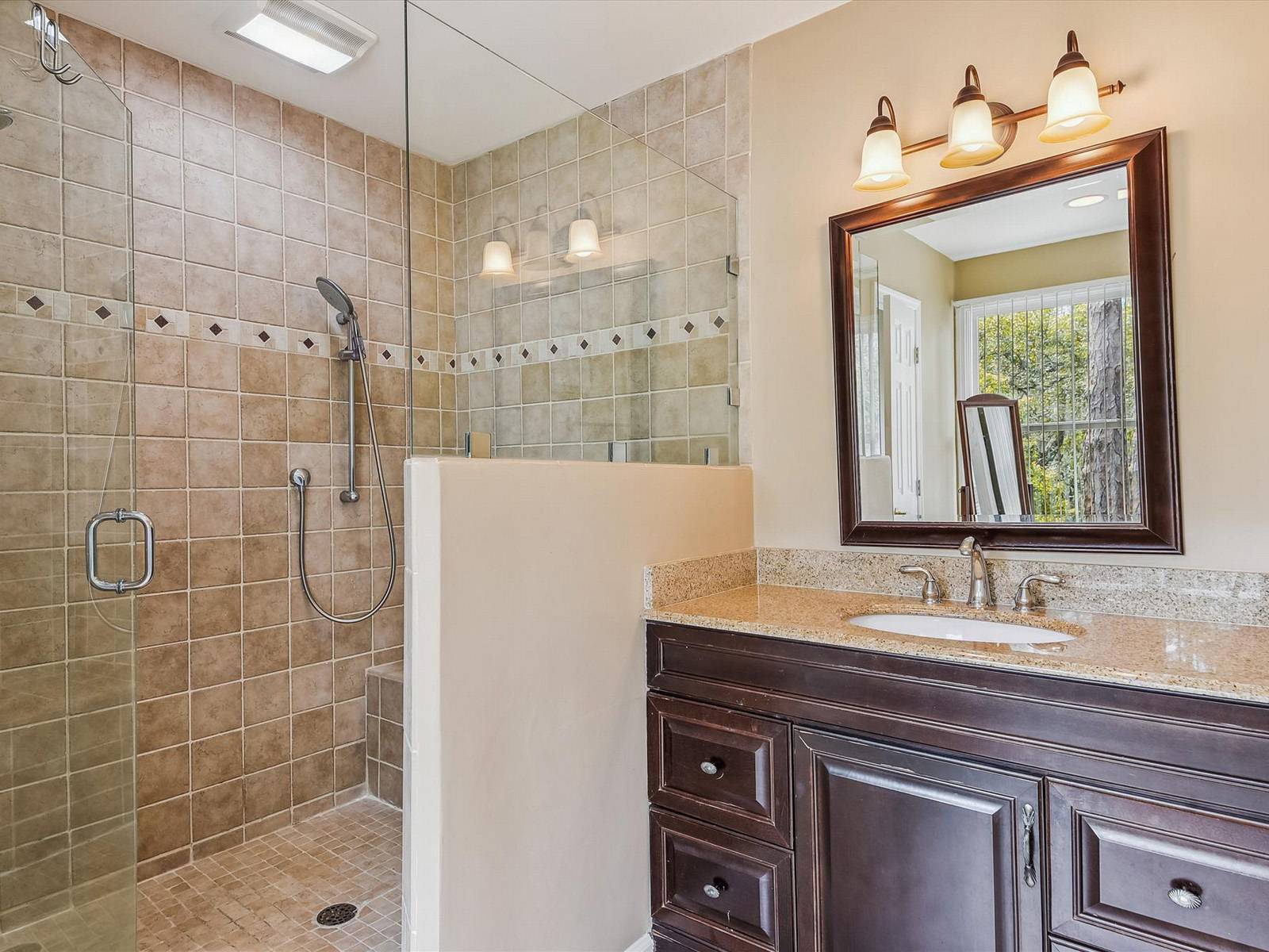 The Palmetto bedroom is also located on the first floor to the left of the entrance. This is the primary bedroom with a king size bed, accent chair, and a 55″ Smart TV. . There are sliding glass doors that lead to the outside deck. The en-suite bath has been fully renovated with gorgeous marble floors, a double vanity and walk-in shower. Additionally, the half bath is located on the first floor.