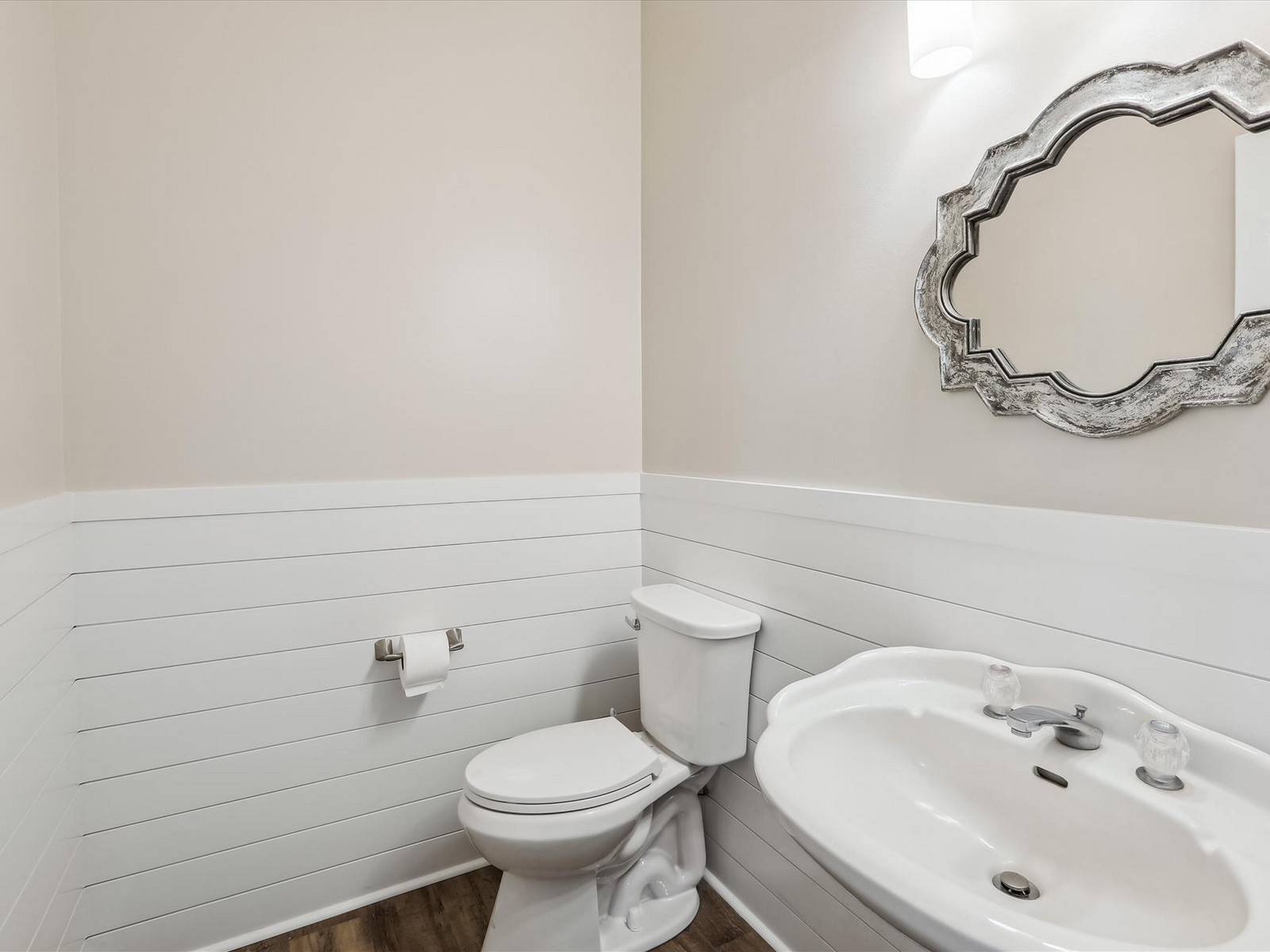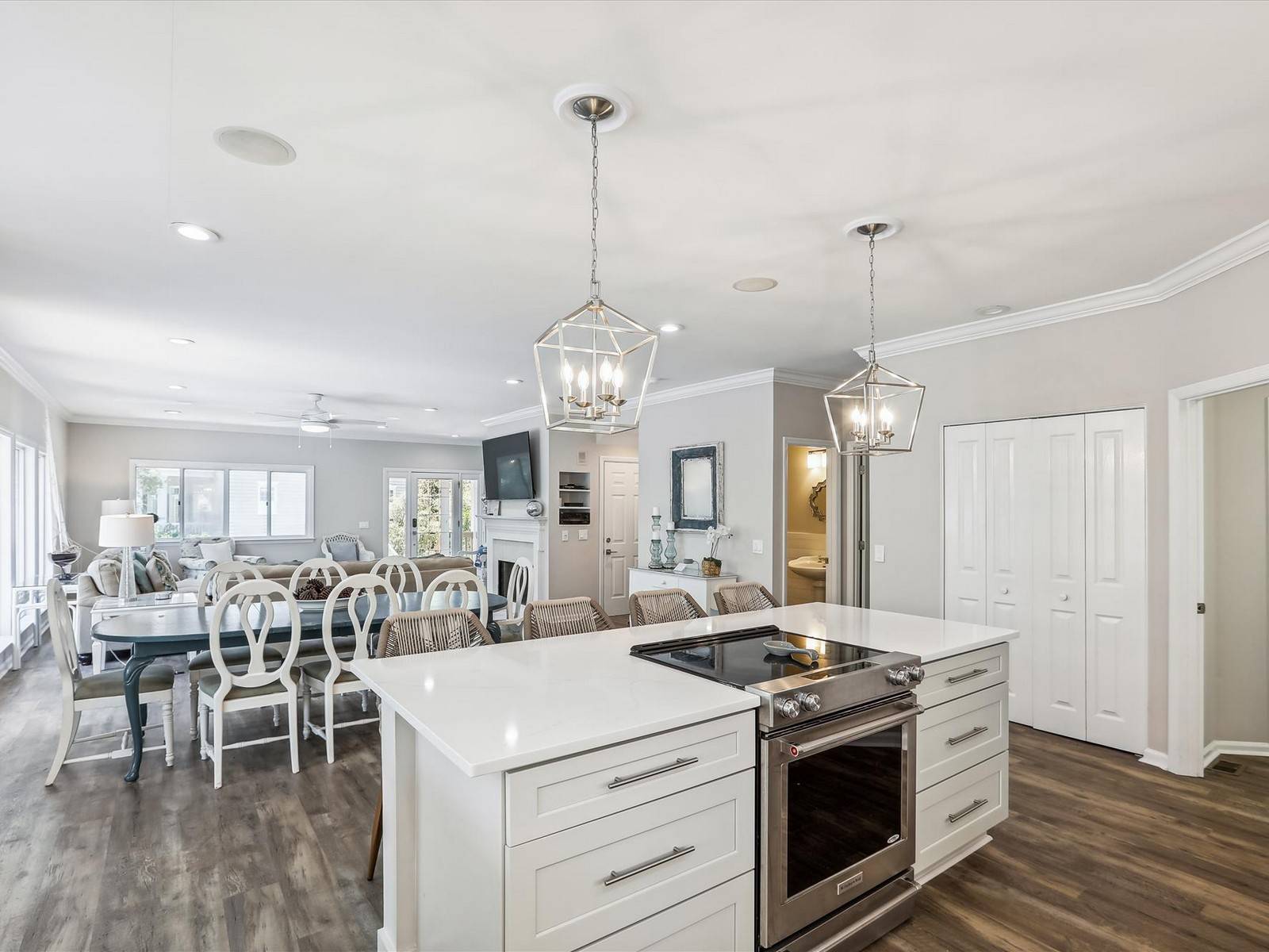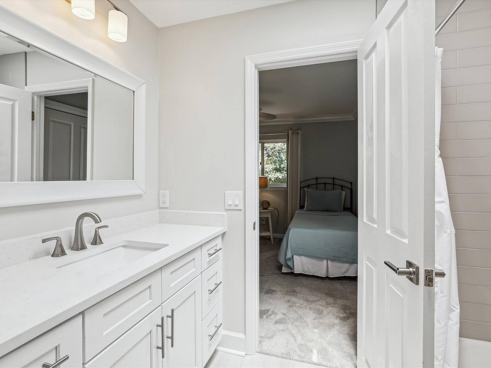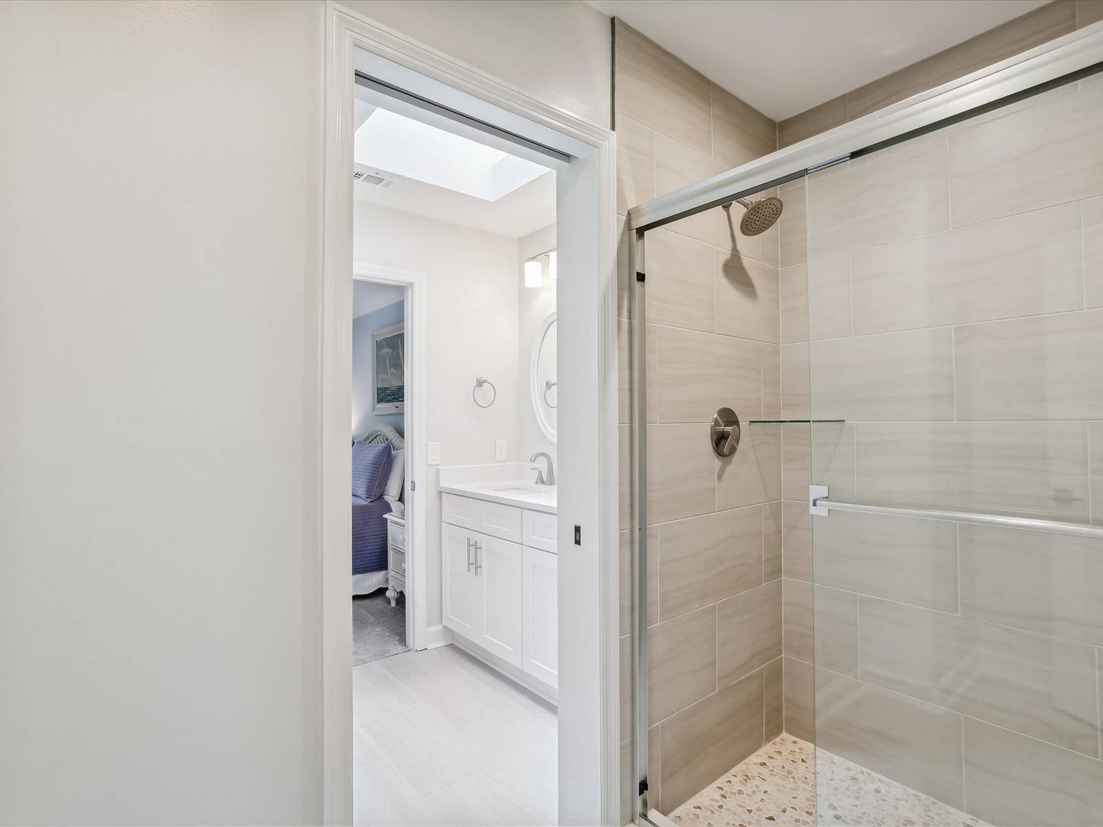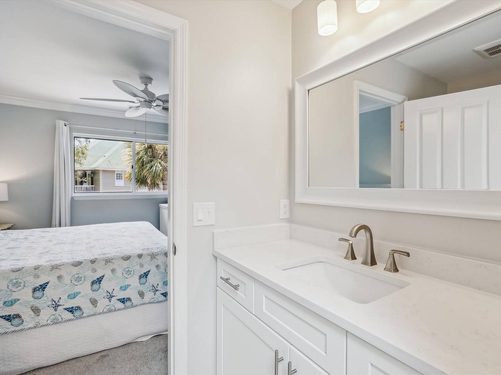 Beautiful hardwood floors welcome you into the main living area. The living room has a large blue sectional sofa, two accent chairs and a 65” Roku TV mounted over the fireplace. Plenty of sunshine comes in from the wall of windows that overlook the pool deck. Behind the sofa is a blue wooden dining room table that seats eight. There are an additional four seats at the adjacent kitchen counter. The kitchen is large, well equipped and is open to the first floor making this the perfect kitchen if you must cook while on vacation. There is also a sunny breakfast room with a large farm table and six chairs located off the kitchen that overlooks the spacious pool area. From this room you can exit to the pool deck. Behind the kitchen is the laundry room with sink, washer and dryer. In the hall there is a ½ bath with a pedestal sink. Down this hall is one of two master suites on the first floor. Each bedroom has newer furniture, nice linens and private bathrooms. The first is a nautical themed bedroom with navy blue walls, king bed, bench seat and mounted 50” Roku TV. The en-suite bath has a double vanity with skylight above and a walk-in shower. To the left of the living room is the other master suite which is carpeted and has blue walls, a king bed, accent chair, walk-in closet and mounted 42” Roku TV. The private bathroom has a double vanity and a walk-in shower.