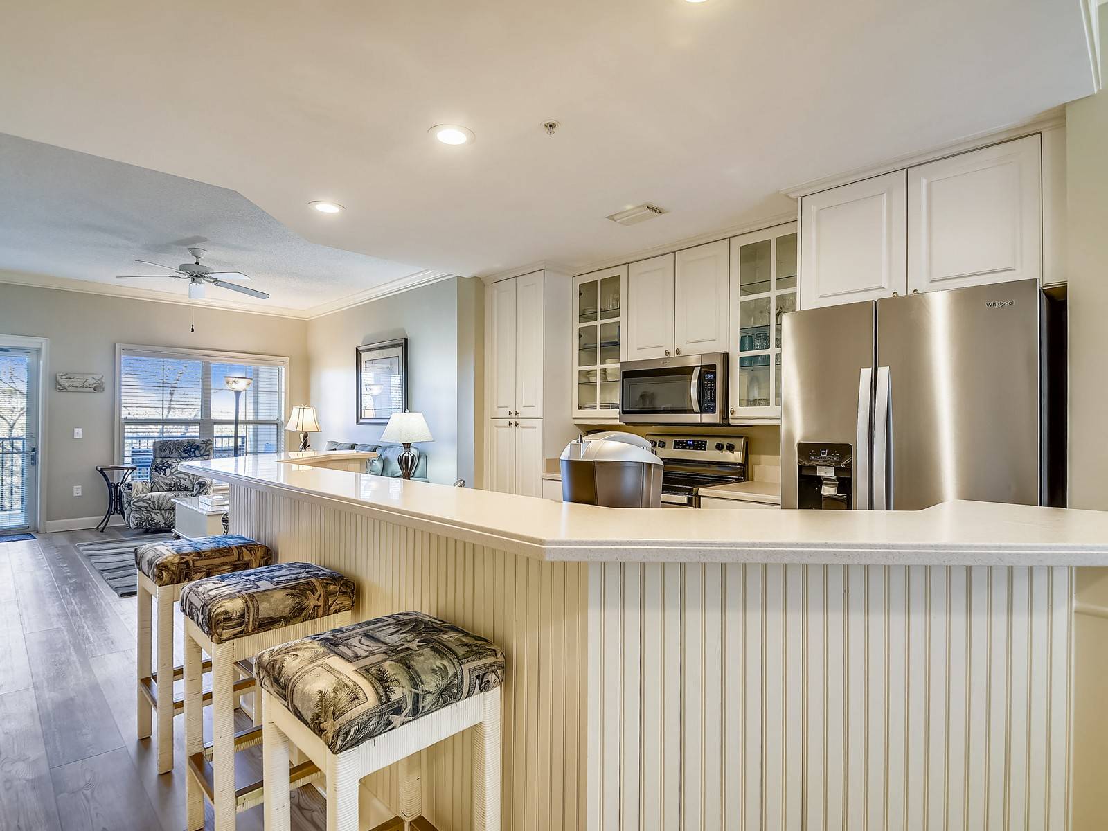 As you walk in to your left is a stackable washer and dryer for any laundry you may need to do. To the right is the dining room with a wood table that seats six. The fully equipped kitchen has a U-shaped counter with four leather stools – a perfect place to enjoy a snack.