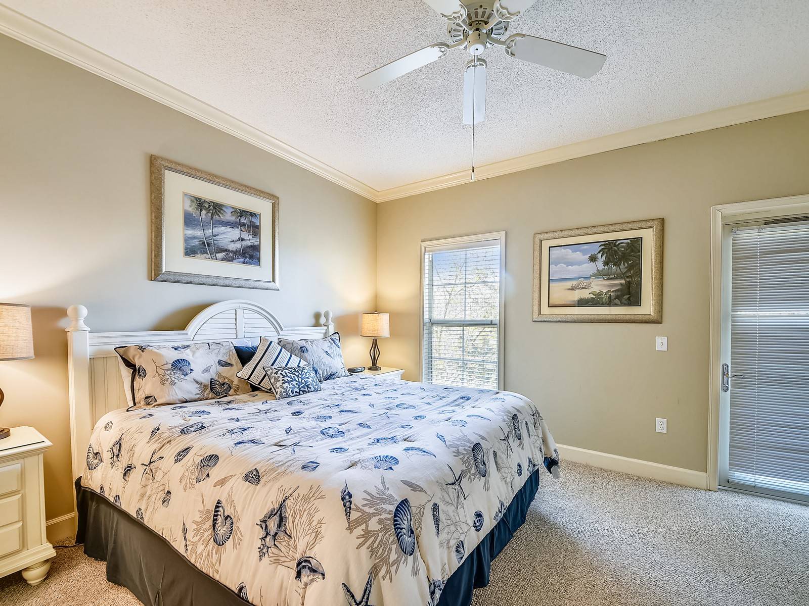 The living area is decorated in a coastal theme and is very inviting and relaxing. There is a light mint green sofa, two coastal rocking chairs and a blue accent chair. The entertainment center has a 42” TV and a DVD player. Outside the French door is the covered balcony with a ceiling fan to help keep you cool with a table that seats four plus two lounge chairs. A great place to relax and enjoy nature!