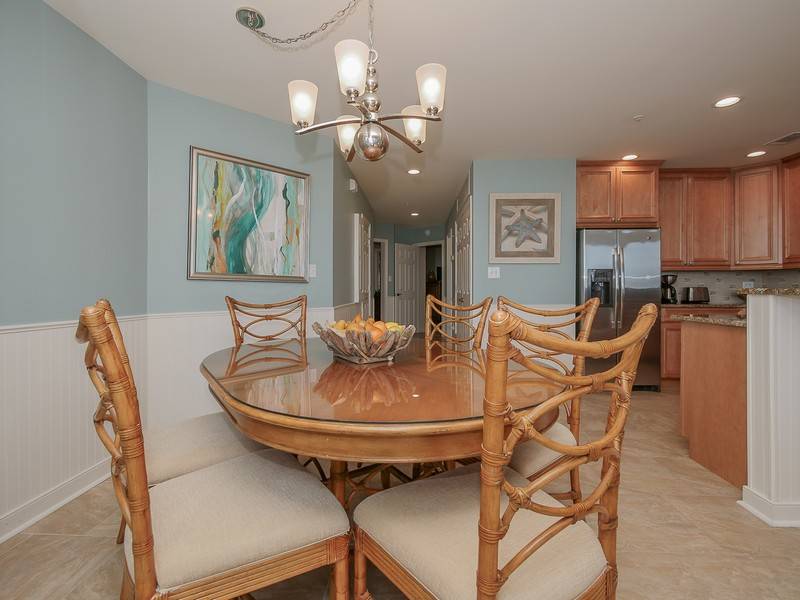 In the dining area there is a wooden table that seats 6. The living room balcony, which can also be accessed by the dining area, provides more of that direct oceanfront view overlooking the landscaped lawn and the sparkling Sea Crest pools off to your right. This balcony also has brand new furniture, featuring a bar height table and four chairs, perfect for dining outside while enjoying the sunset over the Atlantic!