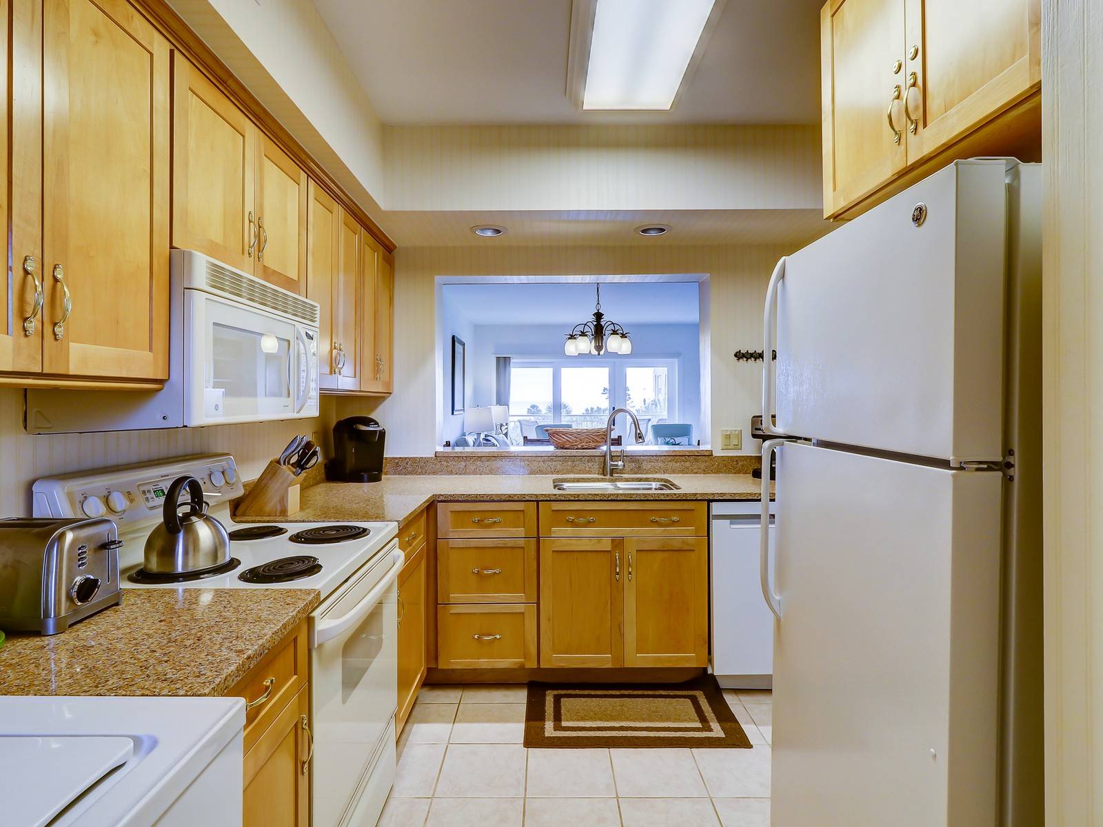 As you walk in the tiled foyer, it opens up to a fully-stocked kitchen. At the back of the kitchen is the washer and dryer. The kitchen opens up to the carpeted dining room and living room. The dining room has a wood table that seats six and a mirrored accent wall. In the living room there is a grey queen sleeper sofa, three accent chairs, a 37” Roku TV and a built-in bookcase full of books. The sliding doors open to a covered balcony that has a table for four. The views from this balcony are so serene and beautiful – the stuff post cards are made of! Enjoy your morning coffee out here before you take a short walk for your morning stroll on the beach. You will be at the beach in less than 2 minutes.