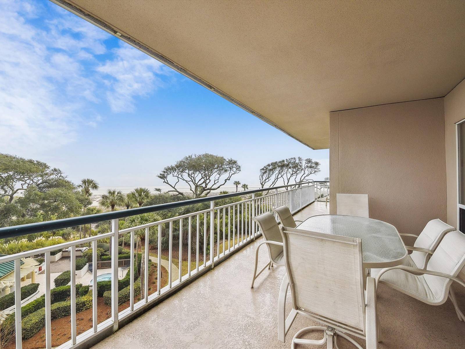 The living and dining areas lead to a 38-foot balcony with stunning ocean and pool views, which is also accessible through two of the unit’s bedrooms. There is a large oval table with seating for six, and an additional chair and footrest for lounging on the balcony.