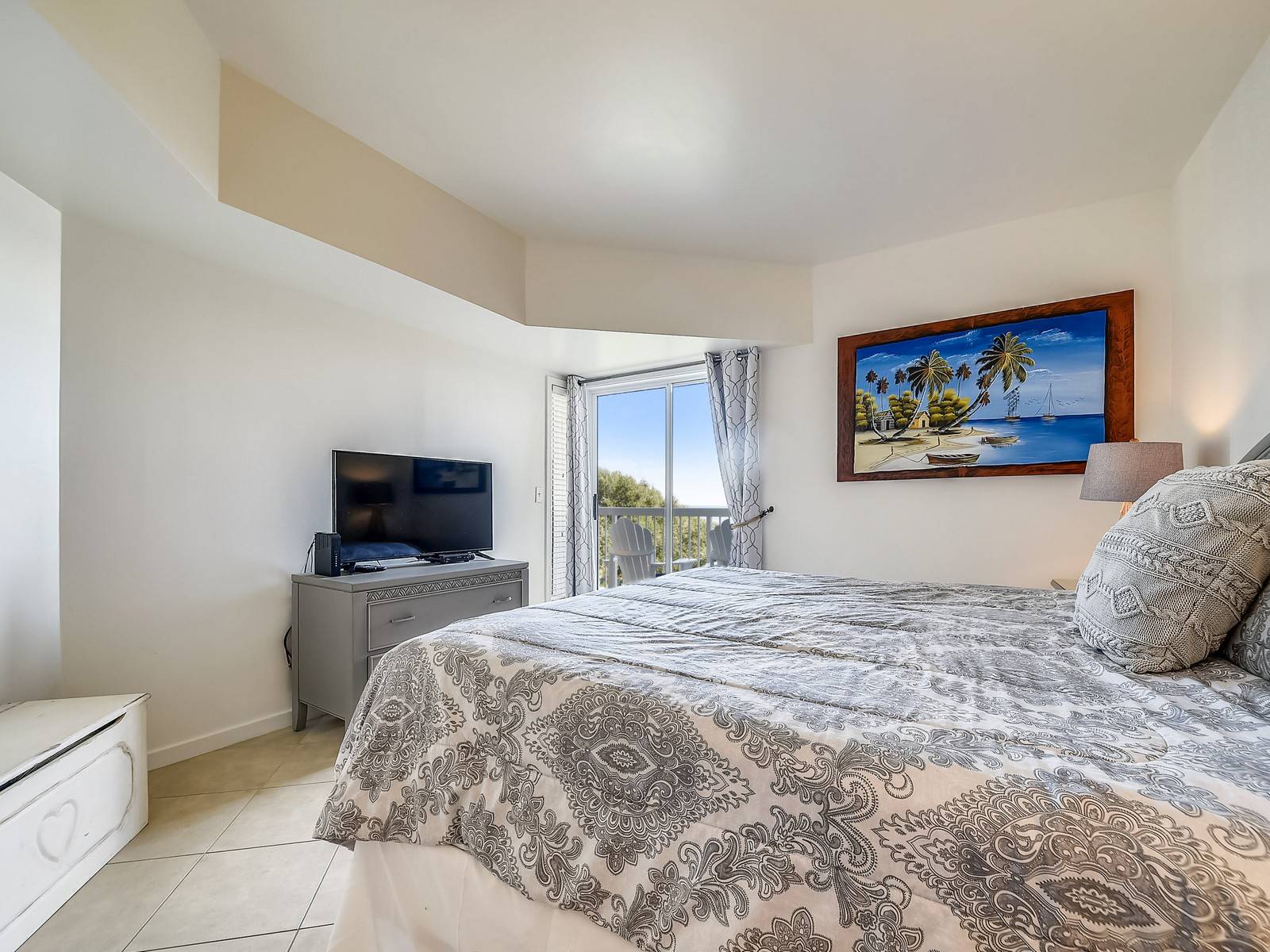 Past the kitchen and dining room, is the living room with beautiful views of the Atlantic Ocean. In the living room there is a queen sleeper sofa and love seat with ottoman and a 64″ Samsung TV. This is a great place for socializing and relaxing after a long day at the pool and beach. You also have access to the balcony which has a large oval table with seating for 5 and 2 Adirondack chairs. The balcony at this property has gorgeous ocean views and is perfect for sitting outside and getting some fresh air! No need to leave your villa for happy hour, the happiest hours will be spent right here!