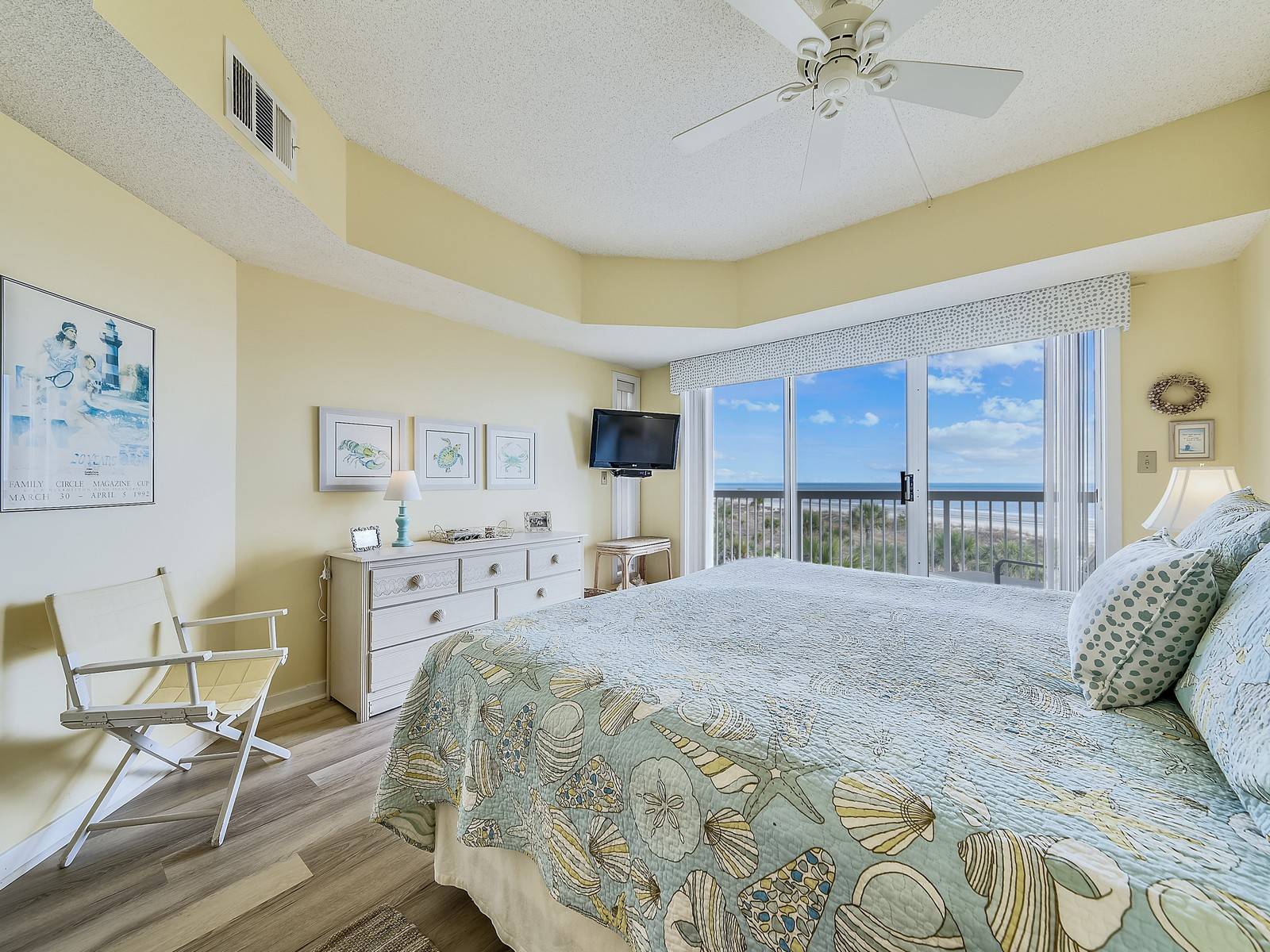 The open floor plan flows to the dining room with a large glass top table that seats six. The living room is adjacent with a Queen sleeper sofa, love seat, a chair with an ottoman, a 36″ flat screen TV and a ceiling fan. The balcony is shared with the master bedroom and offers a direct view of the Atlantic Ocean and has a table with four chairs and a chaise lounge. This is great place to relax and unwind with your favorite book.
