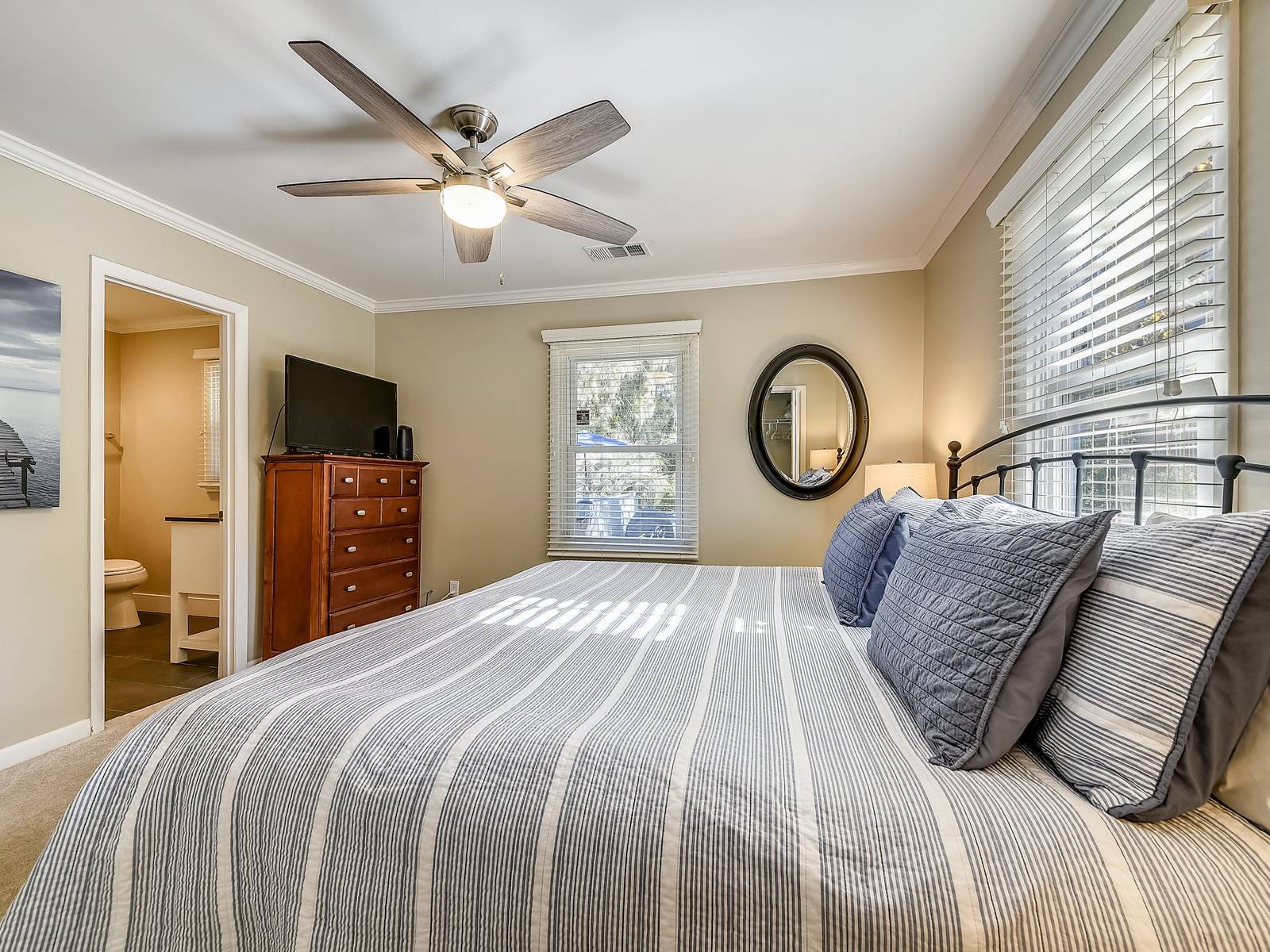 Down the hall from the living room is the laundry room and the three carpeted bedrooms (all have new linens). The first guest bedroom has a queen bed and 22” TV. Across the hall is a bathroom with a single vanity and walk-in shower. Next on the right is another guest bedroom with two twin beds and a 22” TV. At the end of the hall is the master bedroom with a king bed, bench seat, and a 40” TV (firestick). The master bathroom has beautiful stone and granite vanity and a walk-in shower.