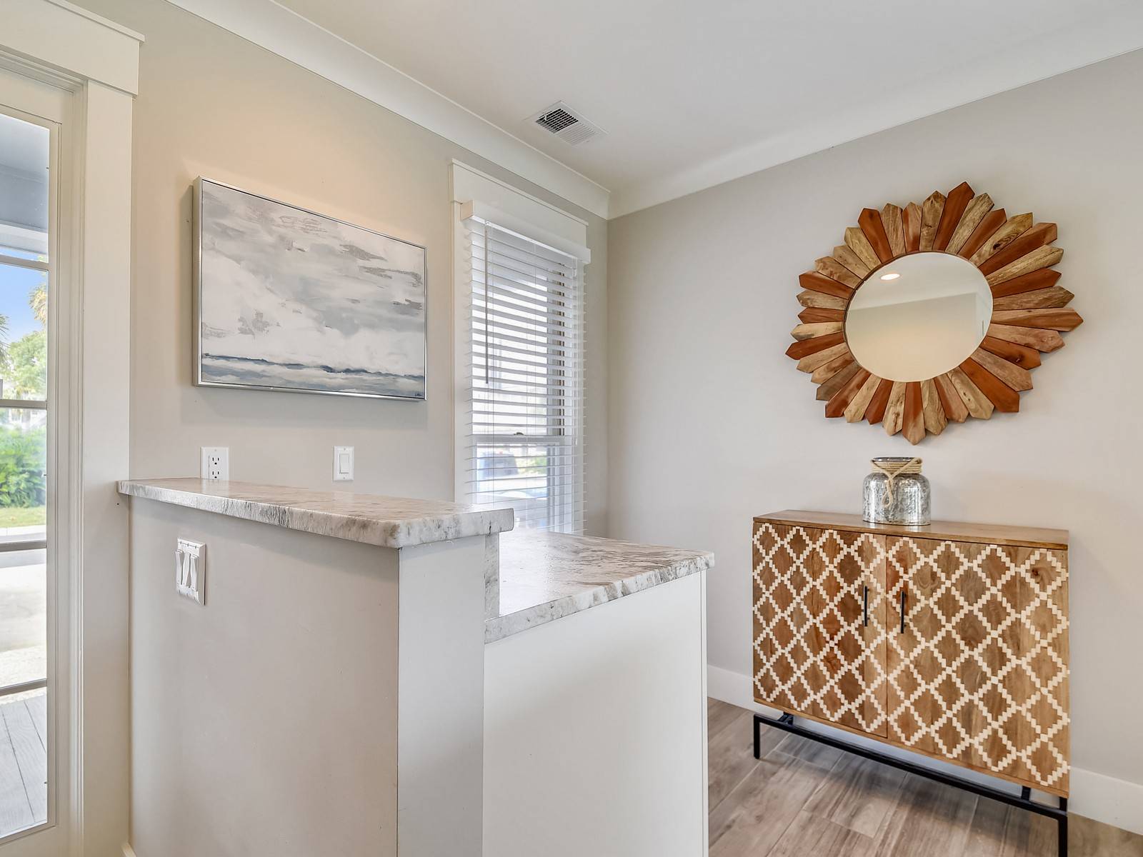 As you walk in, to the left, is a granite top mini bar with a wine fridge. With the complete renovation came all new décor and the subtle, classic, chic coastal theme is gorgeous with all of the natural sunlight in this villa. Hues of light blue, sea foam, and other warm tones mimic the colors of the ocean and sand and are beautifully paired with simple patterns and ocean motifs. There are light hardwood floors throughout the main level and an open concept so you can see the water from each room. The living room has ample seating with a sofa, recliner, reading chair, two swivel rocker chairs and a 55″ TV with sound bar mounted over the fireplace.