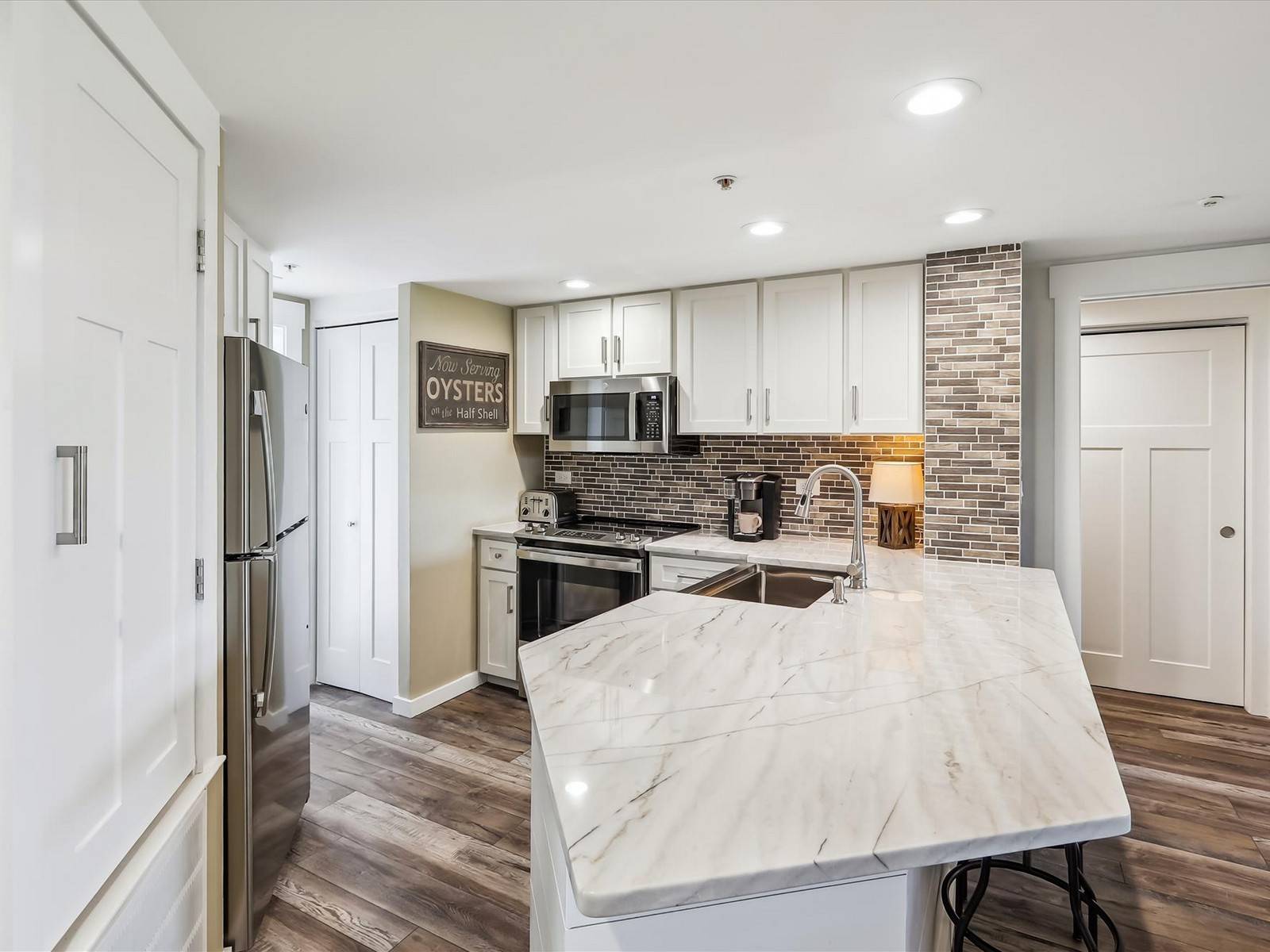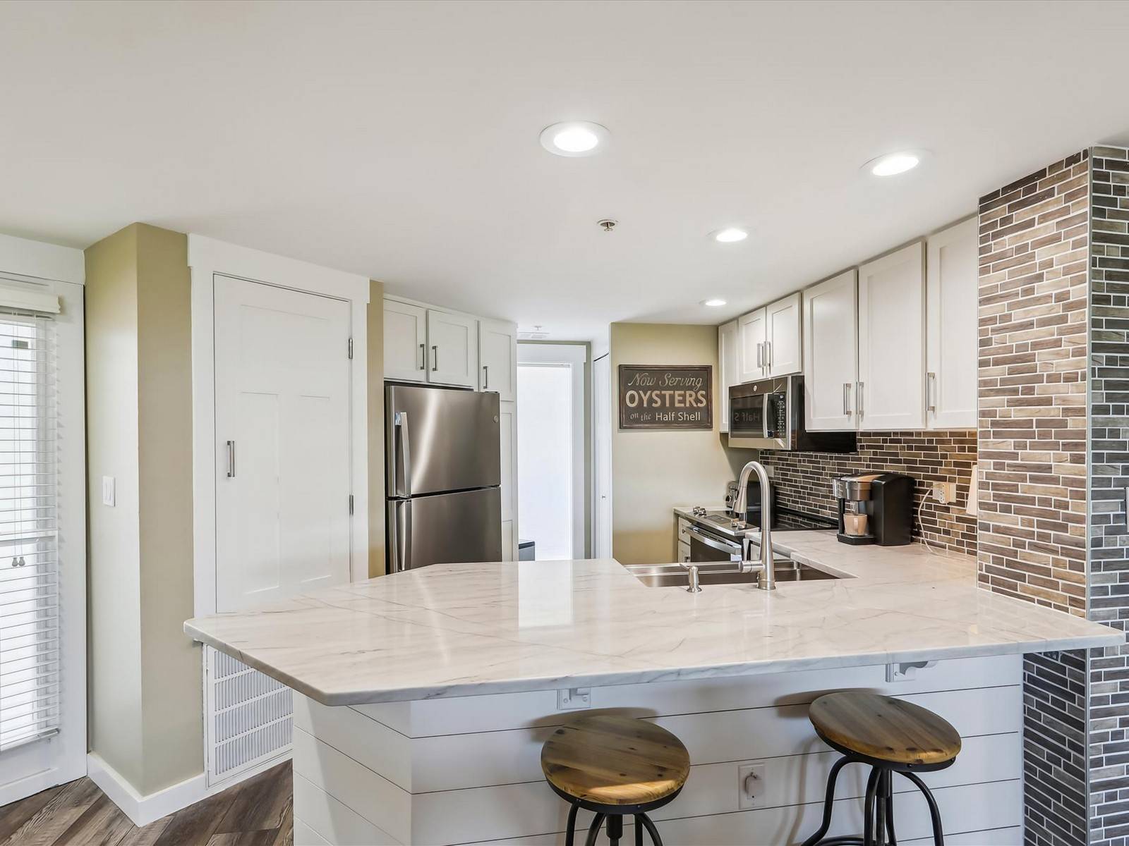 The villa has been beautifully updated with all new flooring, new kitchen and new bathrooms. There is a beautiful glass top table in the dining room with 6 leather chairs. The dining area is adjacent to both the living room and the well-equipped kitchen. Upon entering 502 Barrington, the kitchen is on the left with new cabinets and granite counter tops. It also has a flat top stove, double sinks, and a stacked washer/dryer. There is a roomy breakfast bar with 2 stools.