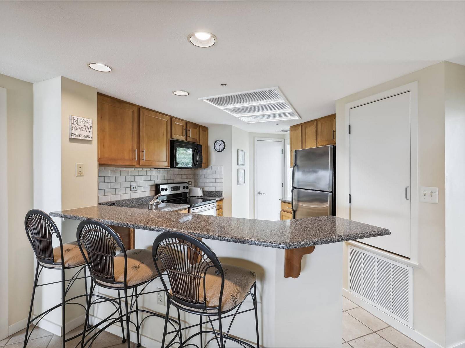 Inside this fifth floor rental, you’ll find an updated kitchen with stainless steel appliances and a breakfast bar, a dining area with seating for four, and a living room with a 50″ SMART TV and access out to the private, furnished balcony with beach and ocean views.