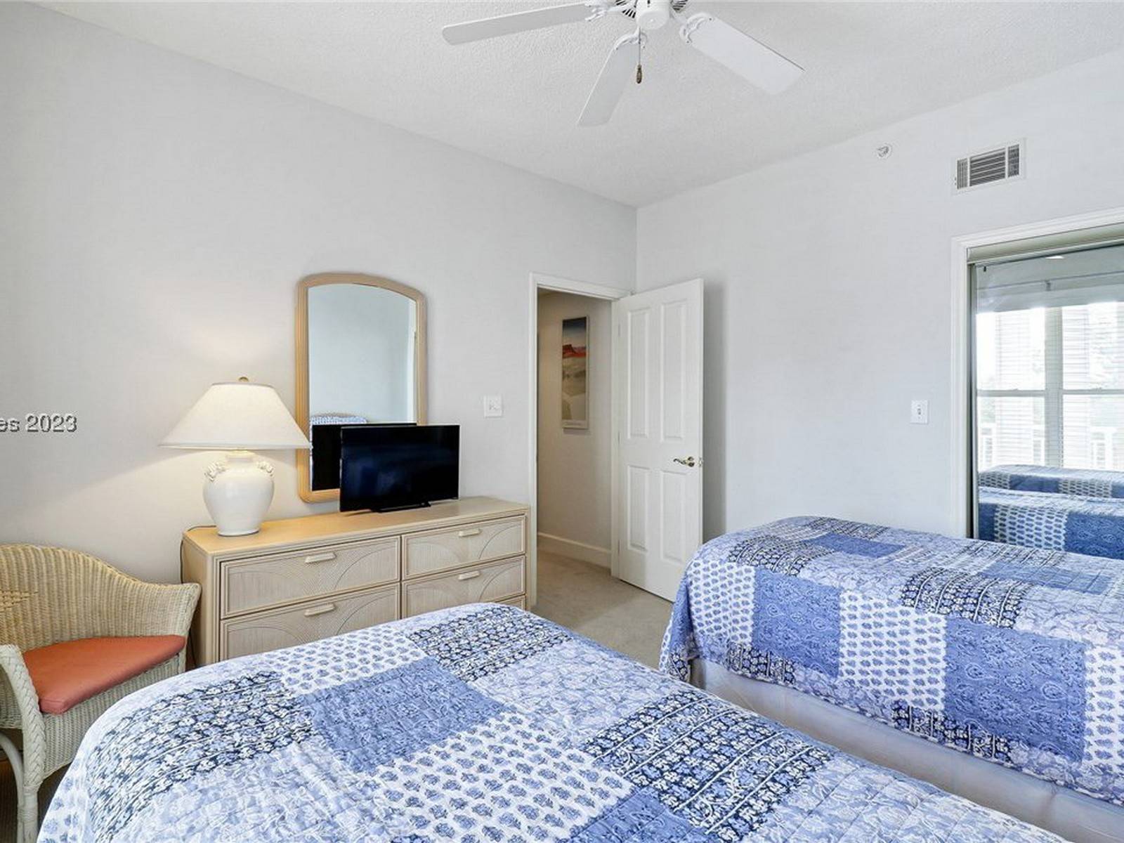 Off the living room is the second bedroom, carpeted, has light blue walls, a king bed, and a TV. The slider opens to a private balcony with two blue Adirondack chairs. Enjoy the ocean views! The private bathroom has two separate vanities and a tub/shower combo.